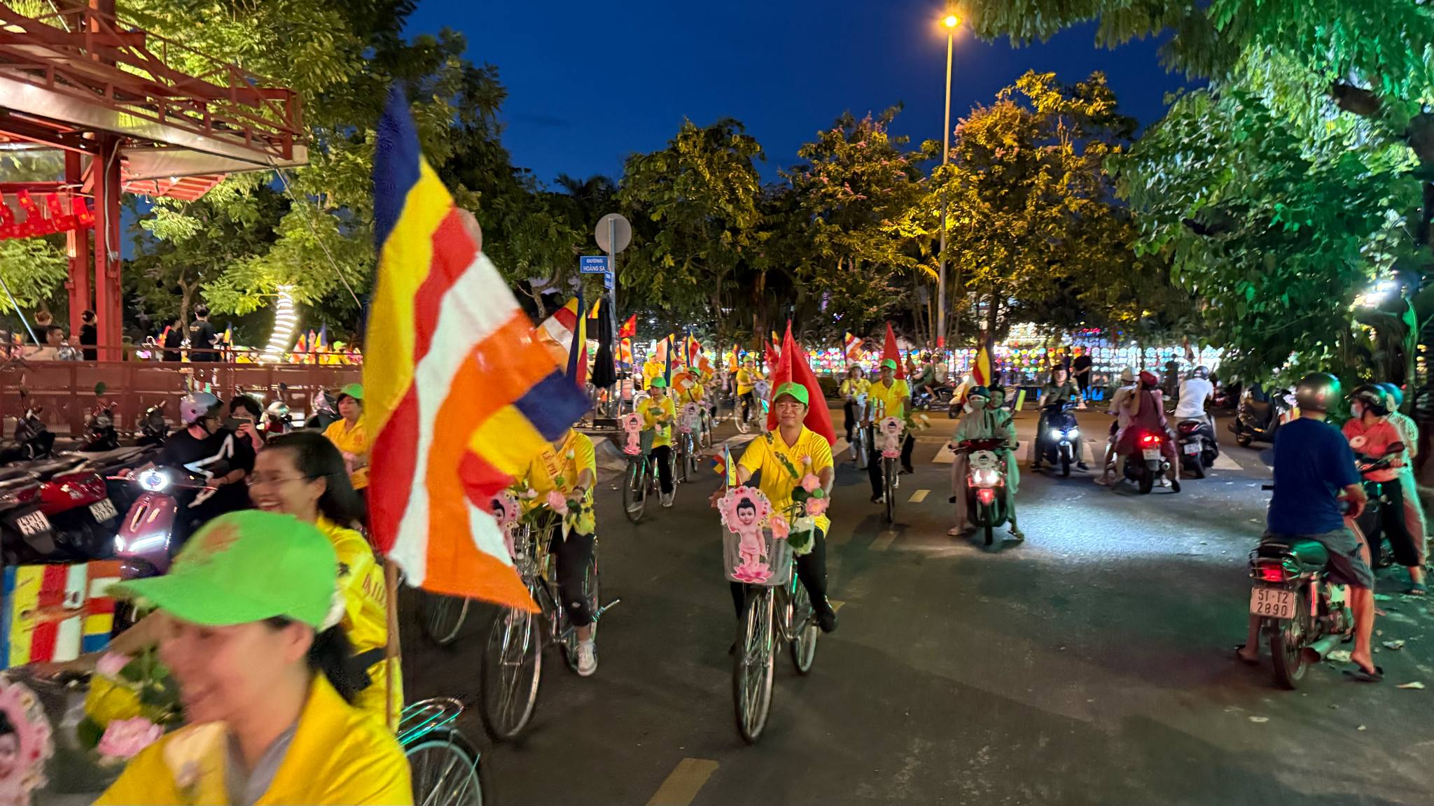 Đoàn diễu hành bao gồm 2 xe hoa dán banner mang nội dung KÍNH MỪNG ĐẠI LỄ PHẬT ĐẢN PL.2569 – DL.2025 với đội hình lần lượt là: Xe dẫn đường – xe hoa BTS – xe hoa – 50 chiếc xe đạp và rất nhiều xe đi theo… tất cả đều được trang trí công phu tỉ mỉ với những biểu tượng thiêng liêng như hình ảnh Phật sơ sinh, hoa sen, bánh xe pháp luân, cờ ngũ sắc, cờ đỏ sao vàng và đèn lồng rực rỡ.