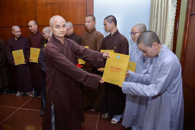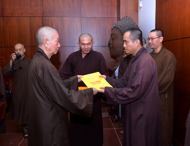 Thành viên Thường trực Ban TTTT đón nhận quyết định từ HT.Thích Trí Quảng (ảnh: Bảo Toàn)