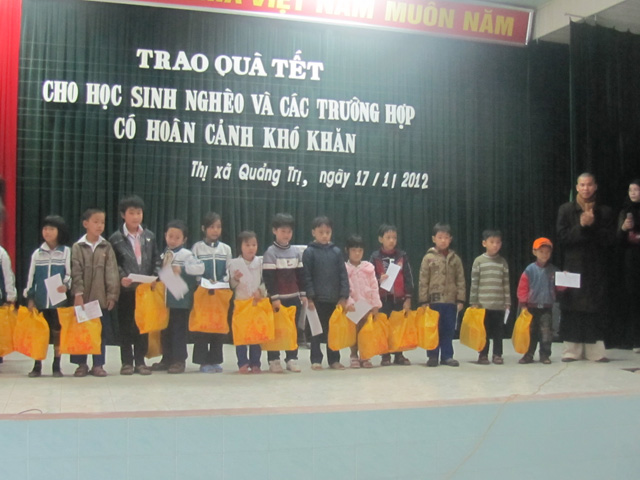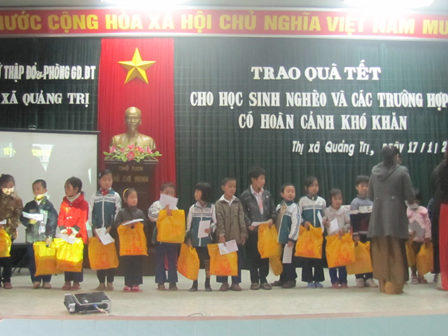 Nhân dịp Tết cổ truyền, đáp lại lời kêu gọi của Phòng Giáo dục- Đào tạo thị xã Quảng Trị, ngày 17-01-2012 (24-12-Tân Mão), Phật tử Quảng Hiền – thành viên Ban Từ thiện xã hội Chùa Hải Quang, thay mặt Thượng tọa Trụ trì và Phật tử Chùa Hải Quang, đến Hội trường UBND Thị xã Quảng Trị, chăm sóc và trao tặng 100 phần quà Tết gồm sách vở, bánh kẹo, sữa và 200.000đ tiền mặt cho 100 em học sinh cấp I và cấp II có gia cảnh nghèo, khó khăn, các em có thành tích học tập giỏi, vươn lên học tốt trên địa bàn thị xã Quảng Trị (Ảnh).