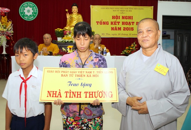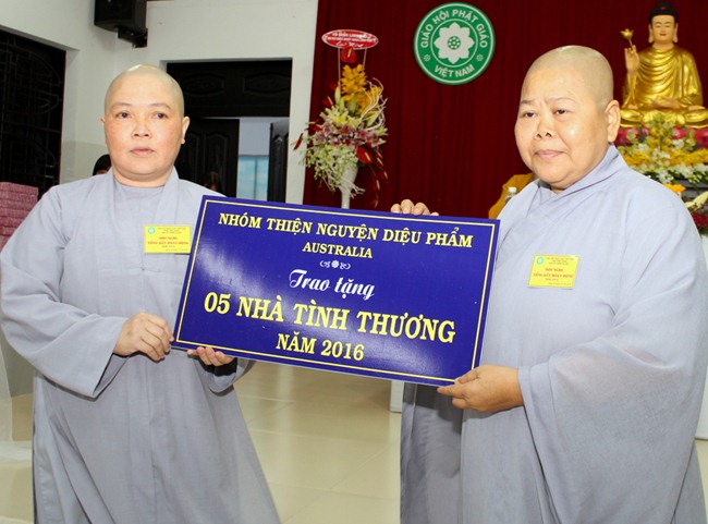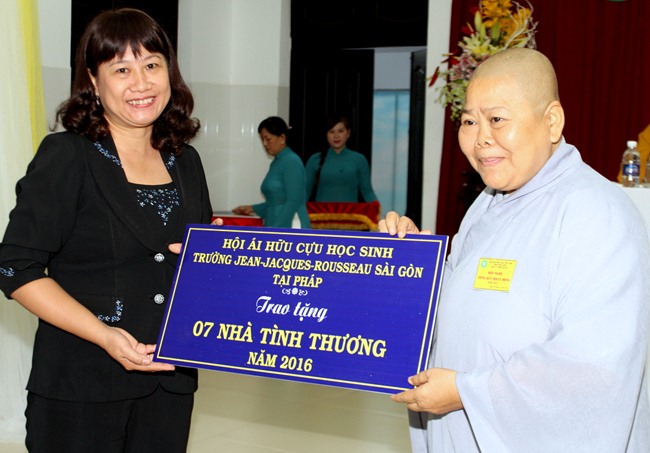 Tiếp theo, NS TN Tịnh Nghiêm – Trưởng Ban TTXH GHPGVN tỉnh Tiền Giang lên nhận biển tượng trưng từ nhà tài trợ Hội ái hữu cựu học sinh Trường Jean –Jacques – Rousseau Sài Gòn tại Pháp tặng 7 căn nhà tình thương trong năm 2016 và Nhóm thiện nguyện Diệu Phẩm – Australia tặng 5 căn nhà tình thương trong năm 2016.