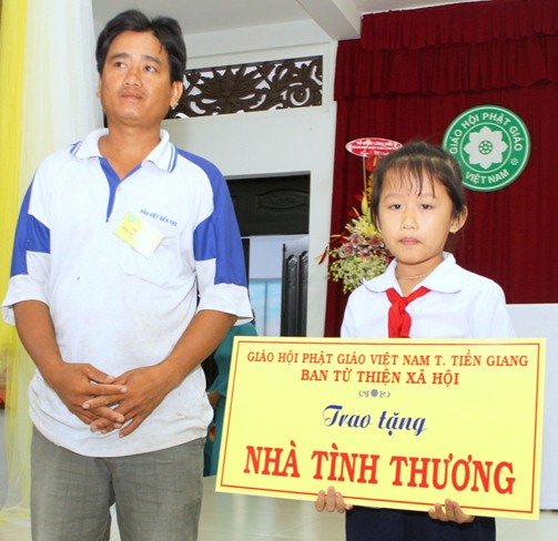 Tại đây, Ban TTXH GHPGVN tỉnh Tiền Giang đã trao biển tượng trưng cho 2 hộ nghèo khó khăn về nhà ở và trao tiền bảo trợ hàng tháng cho những hoàn cảnh đặc biệt khó khăn.