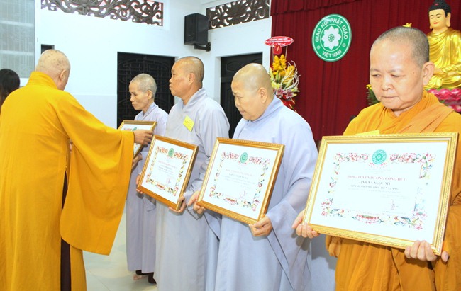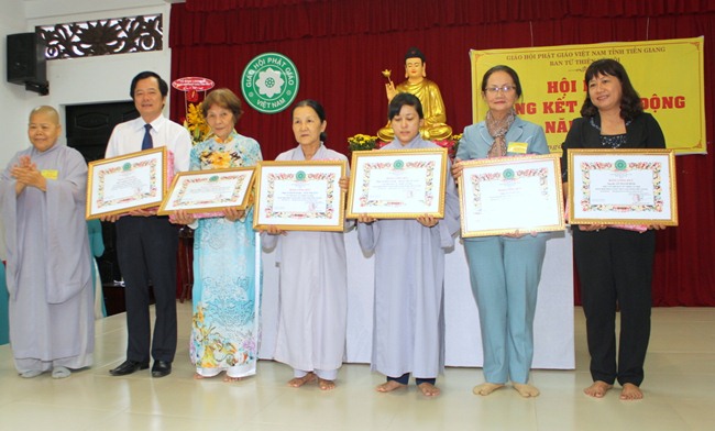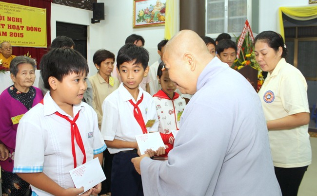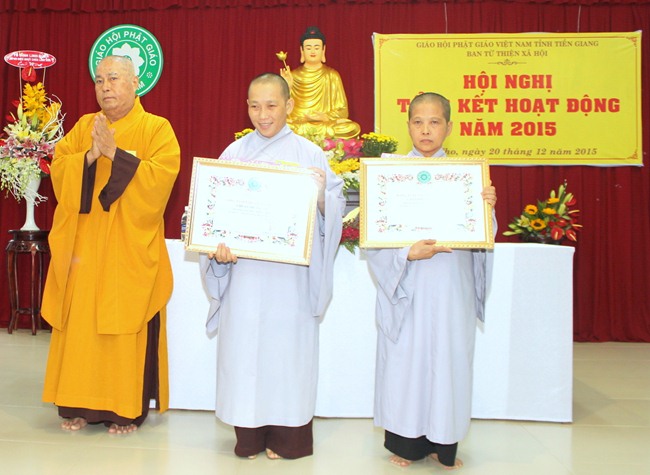 Tại Hội nghị, sư cô TN Tịnh Thủy – Thư ký Ban TTXH PG tỉnh Tiền Giang đọc quyết định khen thưởng của BTS GHPGVN tỉnh Tiền Giang và HT Thích Huệ Minh –  Trưởng BTS GHPGVN tỉnh Tiền Giang; HT Thích Nguyên Tấn đã trao tặng bằng tuyên dương công đức cho 10 tập thể và 12 cá nhân thuộc đơn vị  Ban TTXH GHPGVN tỉnh Tiền Giang và NS TN Tịnh Nghiêm trao 9 bằng công đức cho các phật tử đã hoàn thành xuất sắc công tác từ thiện xã hội năm 2015.