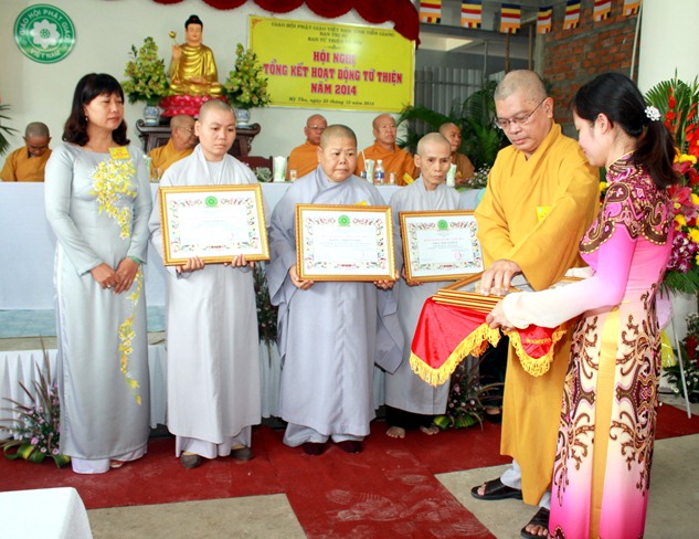 Tiếp theo, ĐĐ Thích Quảng Cường – Phó trưởng BTS PG tỉnh đọc quyết định khen thưởng của BTS GHPGVN tỉnh Tiền Giang và HT Thích Hoằng Đức đã trao tặng bằng tuyên dương công đức cho 6 tập thể và 11 cá nhân đã hoàn thành xuất sắc công tác từ thiện xã hội năm 2014.