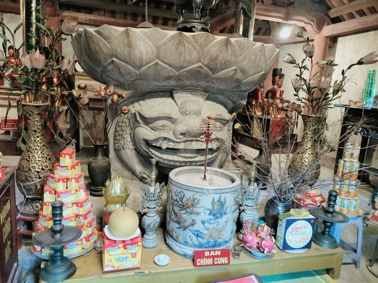 *Thờ cúng: Trong chính điện, thờ tượng bằng đá cao 3m70 vào năm 1041, Lý Thái Tông cho xây Viện Từ Thị Thiên Phúc và đúc tượng Phật A Di Đà nặng 7.560 cân để tôn thờ, ngoài thờ các tôn trượng chư Phật, Bồ-tát ra, còn thờ Lý Thái Tôn, Ngọc Hoàng, Thập Điện Diêm Vương, Hộ Pháp, Bàn đức ông, Ban Thánh Tăng, Bát Bộ Kim Cang, bà Trần Ngọc Am (là vợ của Trịnh Tráng)…