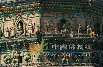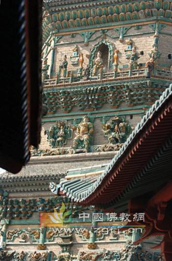 Tháp hình bát giác, 13 tầng, cao 47.31m. Thân tháp xây bằng đá màu xanh, và dùng 3 màu lưu ly vàng, xanh lá cây, xanh da trời để trang sức, mỗi tầng lầu đều có các loại cấu kiện và đồ án như: mái hiên, dưới mái hiên có “đấu củng” (một loại kết cấu đặc biệt của kiến trúc TQ, những thanh ngang từ cột chìa ra gọi là Củng, những trụ kê hình vuông chèn giữa các Củng gọi là Đấu).