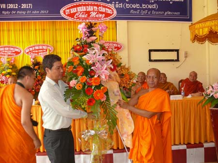 Đại diện lãnh đạo Ủy ban Dân tộc, thành phố Cần Thơ và Phật giáo bắc tông tặng quà buổi họp mặt.