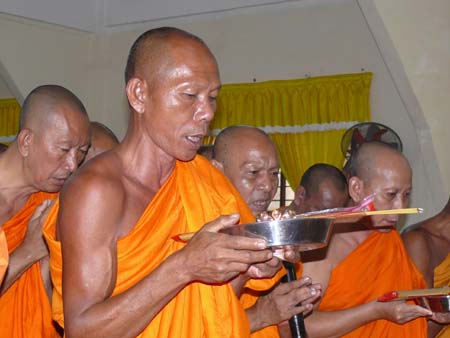 Dâng quà đến sư thầy để thọ hưởng phước báo.