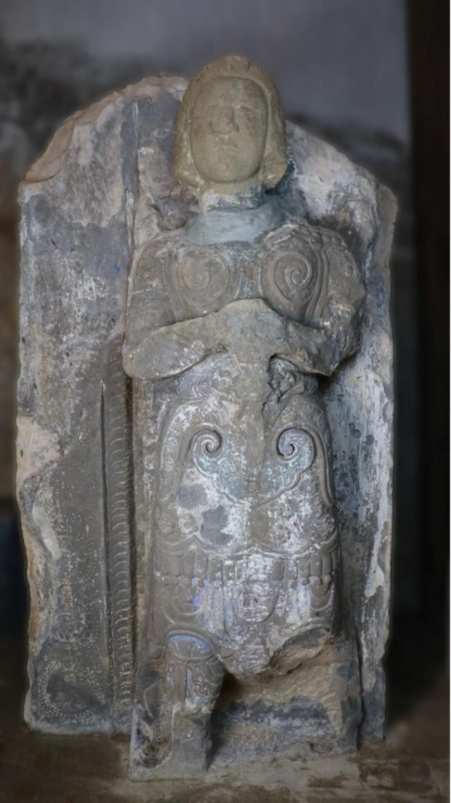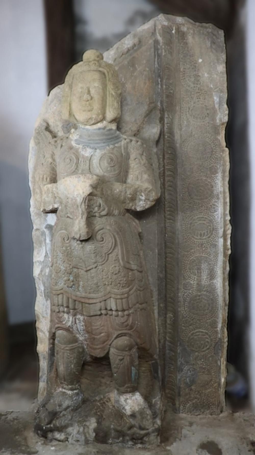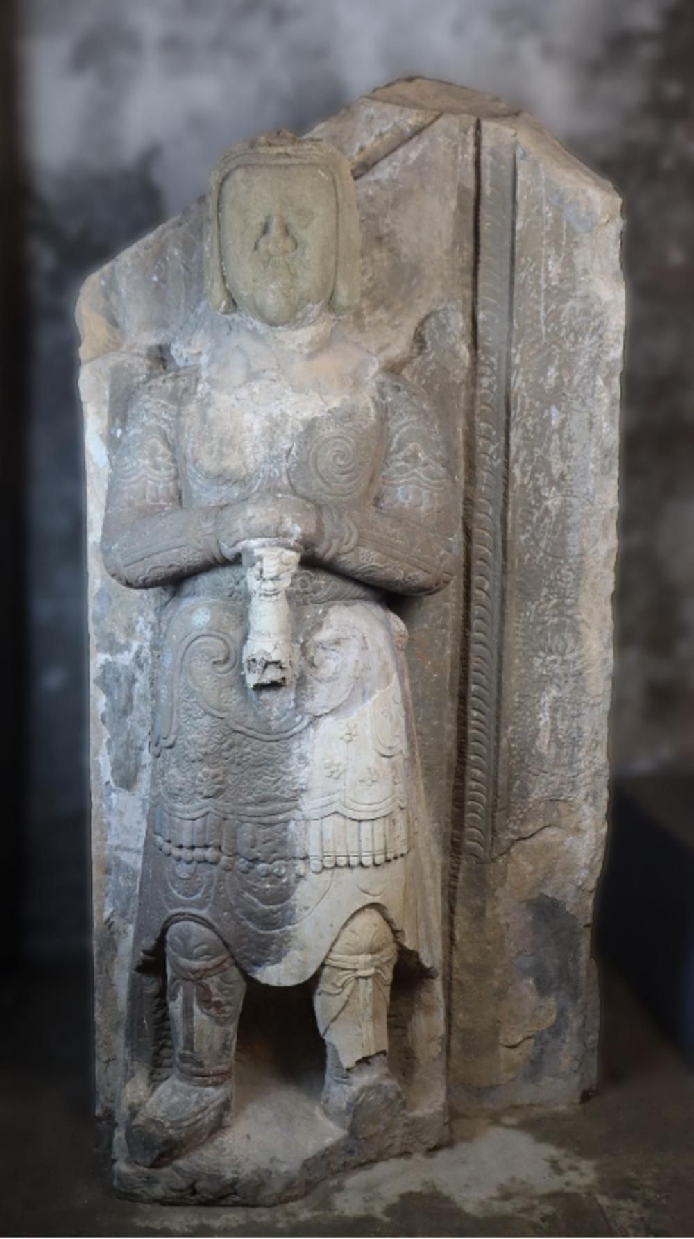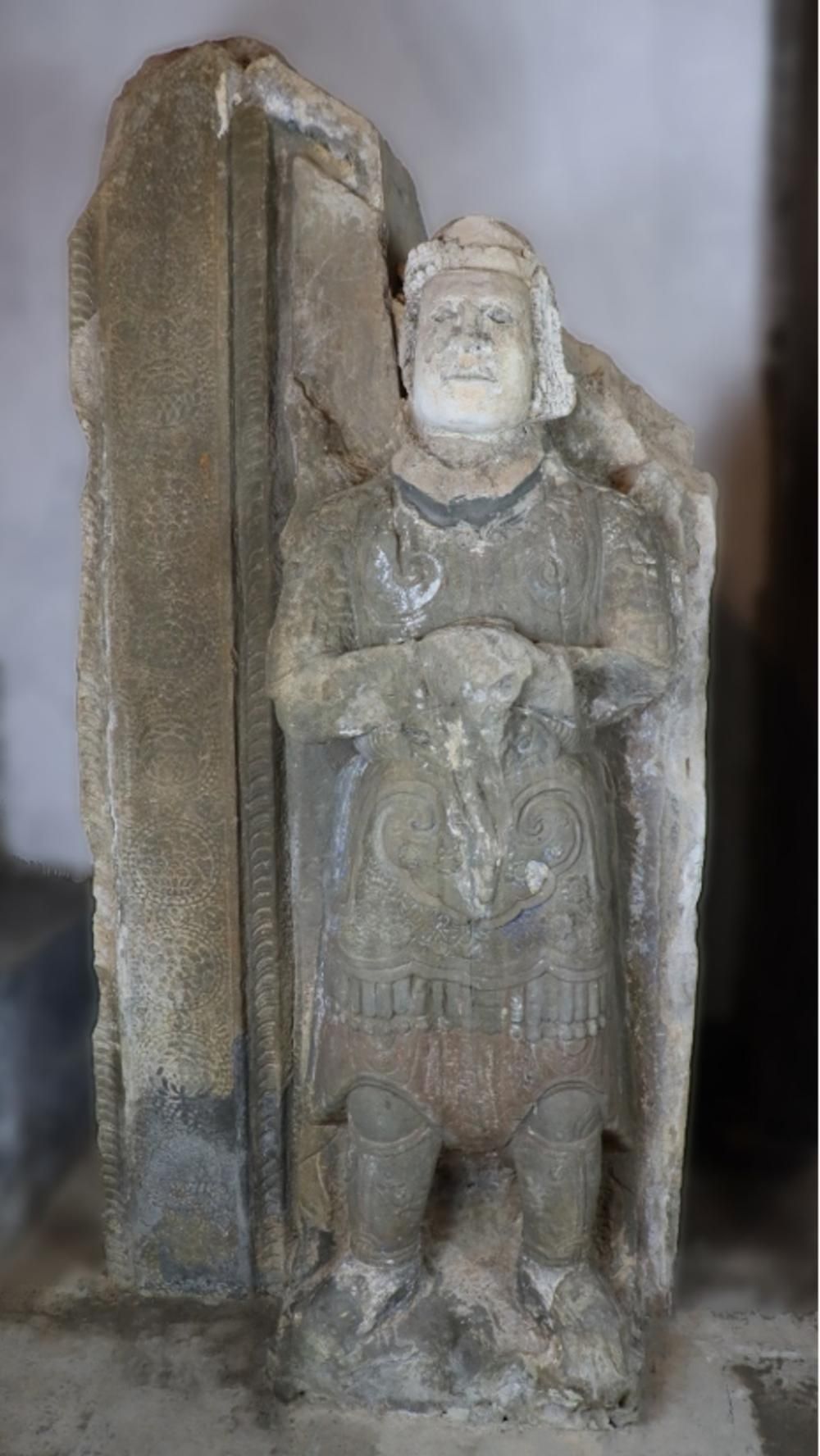 Bộ tượng có dáng võ quan, phong thái ung dung cương nghị, khuôn mặt đôn hậu, đứng nghiêm. Các pho tượng chống kiếm trước bụng, trên giáp phục được chạm những bông hoa nhiều cánh xòe nở, tạo cảm giác toàn thân tượng như phập phồng thở. Mỗi tượng được tạo tác theo phong cách phù điêu trên khối đá hình chữ nhật có hai cạnh bên thẳng, cạnh dưới tạo bằng, cạnh trên được tạo vát xiên một góc 45 độ.