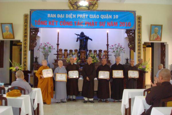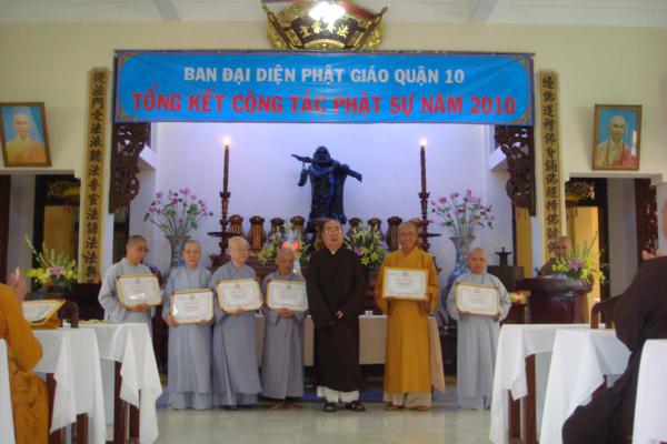 Thượng Tọa Thích Như Thọ, chánh đại diện Phật Giáo Quận 10 cùng toàn thể các Chư Vị Trụ Trì trong quận đã hoàn thành tốt mọi công tác phật sự mà Ban Trị Sự Thành Hội Phật Giáo đã giao và đã có 7 đơn vị và 6 cá nhân nhận được bằng tuyên dương công đức của Thành Hội trao tặng, tiêu biểu là chương trình từ thiền, cứu trợ bão lụt với nhiều đợt cứu trợ tổng kinh phí lên đến hàng tỷ đồng.