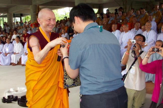 Sau nghi thức tụng nệm hoàn mản, vị nguyên Chủ tịch hội Sakyadhita và vị đương kim Chủ tịch hộị đã cùng nhau trao giải thưởng cho các Đại biểu trình bày tham luận xuất sắc và những Tình nguyện viên tham gia đắc lực cho Hội nghị.