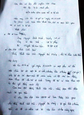 Thưa Thầy, con đang gặp khó khăn và sức khỏe của con hiện giờ mỗi ngày một yếu… nên hôm nay con nhờ Thầy hãy thương xót cho mẹ con của con mà cho con được gửi con gái của con về cho thầy, nhờ thầy chăm sóc và nuôi nó giúp con… Bé gái sinh vào 23h15 ngày 04/1/2018.
