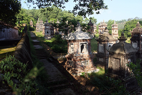 Trong đó vườn tháp có diện tích gần tám nghìn m2 với hơn 100 ngôi tháp là nơi tàng lưu xá lị, tro cốt nhục thân của các tăng ni. Tháp mộ được xây dựng theo những quy định riêng và rất chặt chẽ của thiền phái. Hệ thống tháp mộ được chia thành 2 khu vực: phía trên là tháp sư tăng, phía dưới là tháp sư ni và khu vực thấp hơn dành để xây mộ cho những người chấp tác trong chùa. Các ngôi tháp đều được xây bằng gạch chỉ và đá với kỹ thuật truyền thống bắt mạch vôi mật mía và bột giấy bản nên rất bền và mịn.