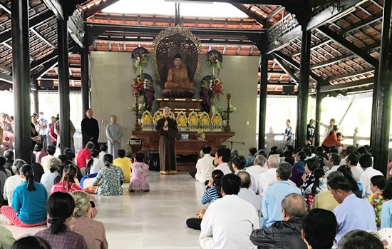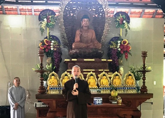 Trước khi nhận quà, bà con địa phương tập trung tại chính điện chùa Long Hoa để quý thầy hướng dẫn về kỹ năng sống, phương pháp tu tập và niệm Phật tịnh tâm.