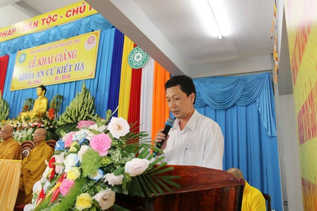 HT.Thích Nhựt Tấn – Trưởng BTS PG tỉnh tuyên đọc Diễn văn khai mạc khóa an cư kiết hạ PL.2562-DL.2018; tiếp theo ĐĐ. Thích Trí Thọ – UV (dự khuyết) HĐTS T.Ư GHPGVN, Phó ban kiêm Chánh Thư ký BTS PG tỉnh, báo cáo tiến trình tổ chức An cư kiết hạ. Theo đó: “ mùa hạ năm nay, Ban Thường trực BTS PG tỉnh quyết định tổ chức “ Khóa bồi dưỡng Trụ trì lần thứ 2”, và mời Ban Tôn Giáo (Sở Nội Vụ tỉnh); UBMTTQ tỉnh Bến Tre – trợ giúp đề cử giảng viên hướng dẫn: Các văn bản pháp luật; quan điểm chủ trương đường lối chính sách có liên đến Tôn giáo; tình hình kinh tế; chính trị; An sinh xã hội; An ninh quốc phòng…v.v..trong tỉnh Bến Tre…”