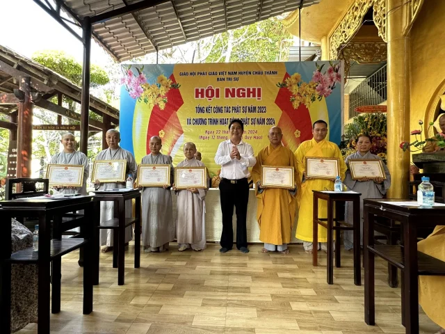 Tại Hội nghị, Ủy Ban Nhân dân tỉnh, huyện và UBMTTQVN huyện Châu Thành đã trao tặng Bằng khen cho BTS GHPGVN huyện và các cá nhân là Tăng Ni huyện nhà đã có nhiều thành tích vận động, ủng hộ vật chất, xây dựng giao thông nông thôn, nhà Đại đoàn kết, thực hiện công tác an sinh xã hội trên địa bàn tỉnh Bến Tre.