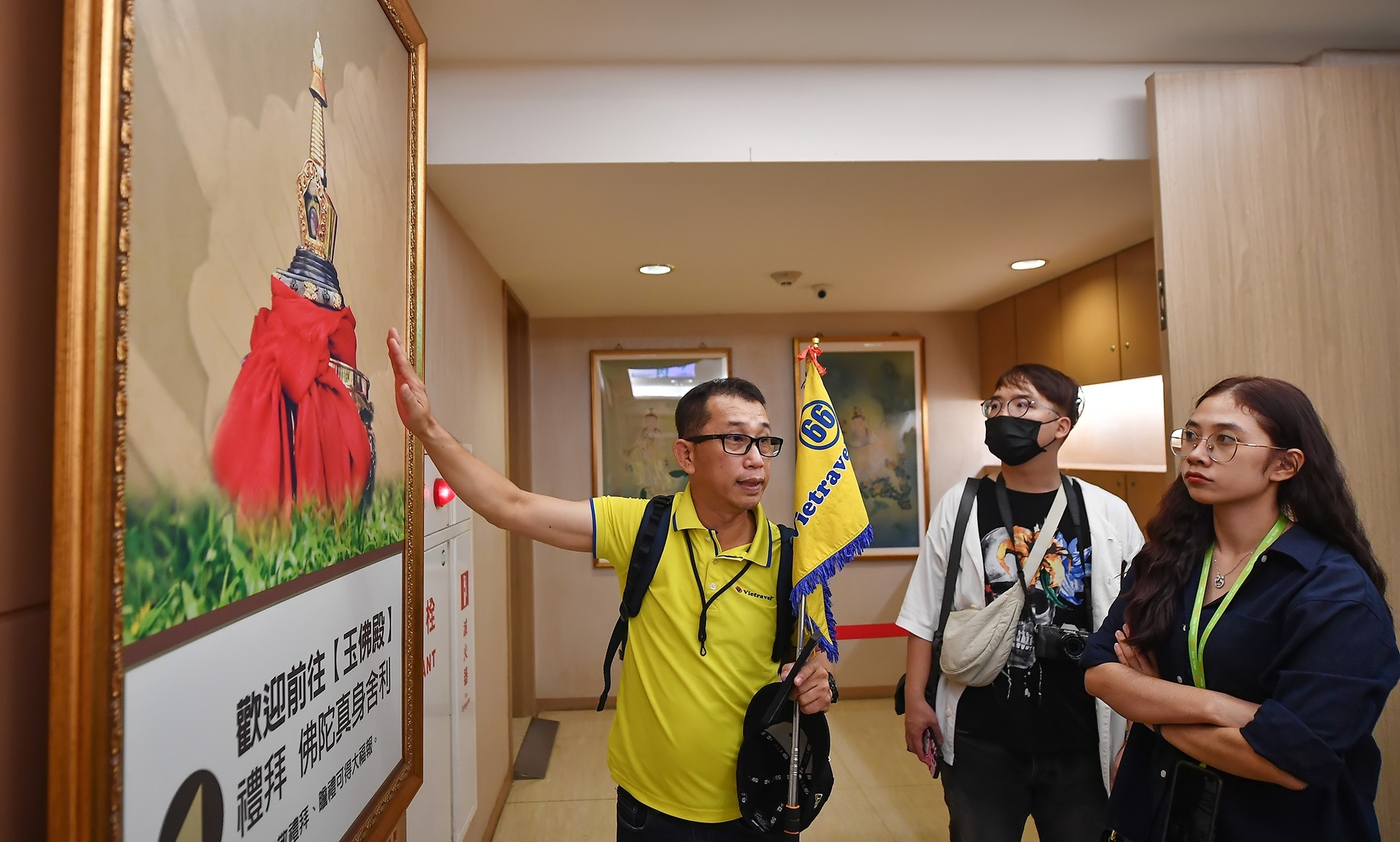Phía ngoài cửa có treo bức hình xá lợi này để du khách tìm hiểu rõ hơn về xá lợi Đức Phật.