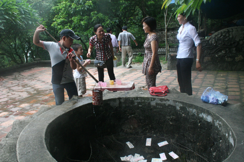 | Người dân đang lấy nước giếng Ngọc uống cầu may. |
