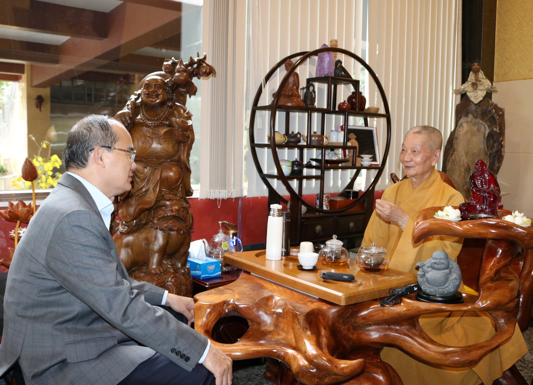 Hoà thượng phó Pháp Chủ thân mật tiếp lãnh đạo Thành uỷ