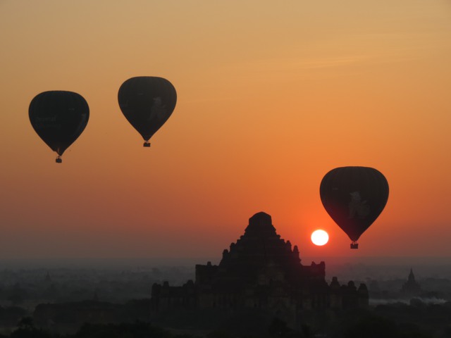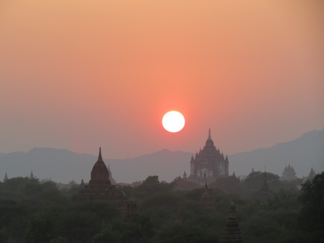 Đến với Bagan, chúng tôi đón nhận bình an đến lạ thường. Ngày nào cũng tôi cũng 2 lần ngắm mặt trời mọc và lặn. Trời Bagan về đêm khá lạnh. Chúng tôi mặc áo ấm để từ 3h30 lên xe ngựa hướng về ngôi chùa cao nơi đây và nhẹ nhàng trèo lên ngồi thiền sớm mai. Không khí trong lành và se lạnh. Những ánh nến được đoàn chúng tôi thắp lên ấm áp và tinh khôi. Chúng tôi im lặng ngồi thiền làm cho các bạn nước ngoài khác cũng thiền theo. Chúng tôi lễ Phật để các bạn phương tây cũng cùng lễ Phật. Chúng tôi niệm Phật và hầu như ai xung quanh cũng cùng niệm. Bình an và tràn đầy nặng lượng. Sớm mai đẹp làm sao.