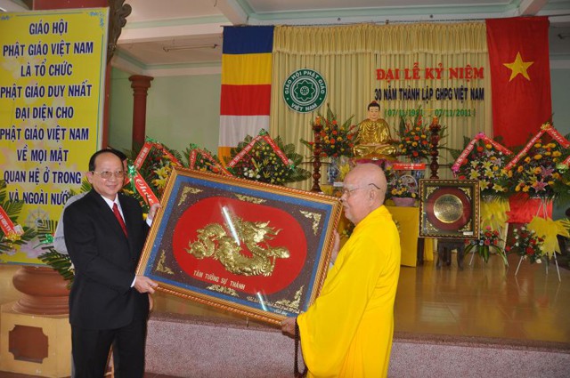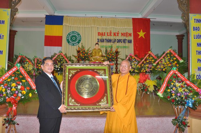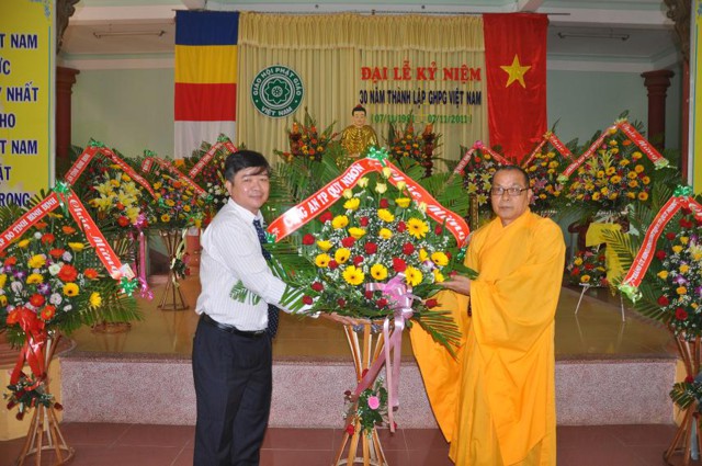 Ban tổ chức đại lễ kỷ niệm 30 năm thành lập GHPGVN trân trọng đón nhận những kỷ vật, những lẵng hoa chúc mừng của: Tỉnh ủy, UBND, UBMTTQ VN tỉnh, Sở nội vụ, Ban tôn giáo, Sở giáo dục và đào tạo, Hội chữ thập đỏ tỉnh, UBND thành phố Quy Nhơn, UBND phường Trần Hưng Đạo, những lẵng hoa chúc mừng của các Ban, Phân ban BTS tỉnh GHPG Bình Định.