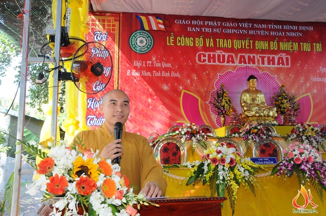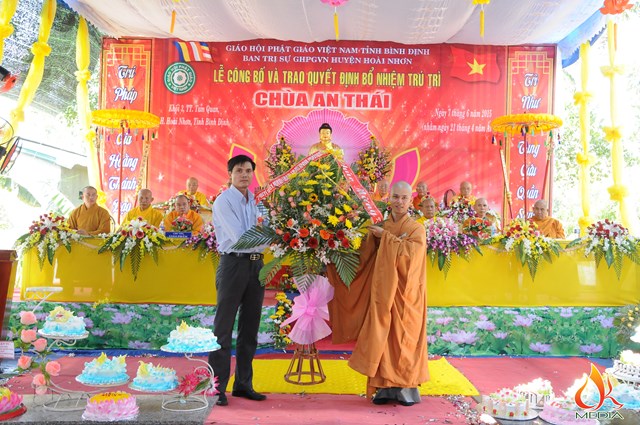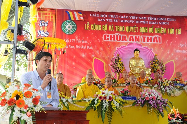 Đại diện Chính quyền địa phương, Ông Nguyễn Văn Hiệp, P.Phòng Nội vụ huyện Hoài Nhơn phát biểu chúc mừng chùa An Thái được Giáo hội bổ nhiệm vị Thầy Trú trì, Ông đánh giá cao tinh thần đoàn kết hòa hợp, đồng hành cùng dân tộc và ghi nhận những đóng góp của Phật giáo trong công tác từ thiện xã hội, xây dựng và phát triển đất nước, hộ quốc an dân của Phật giáo Việt Nam nói chung và huyện Hoài Nhơn nói riêng.