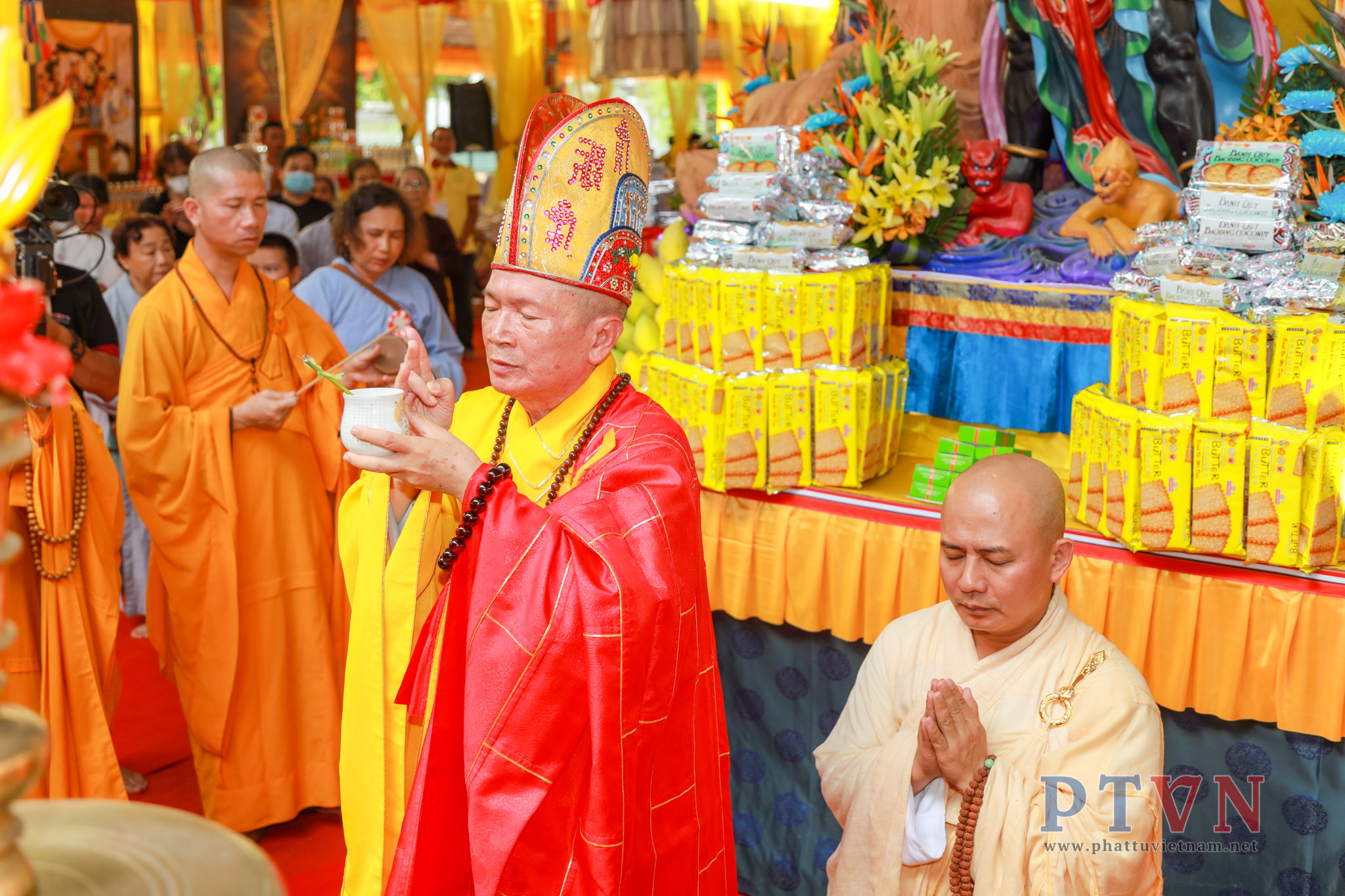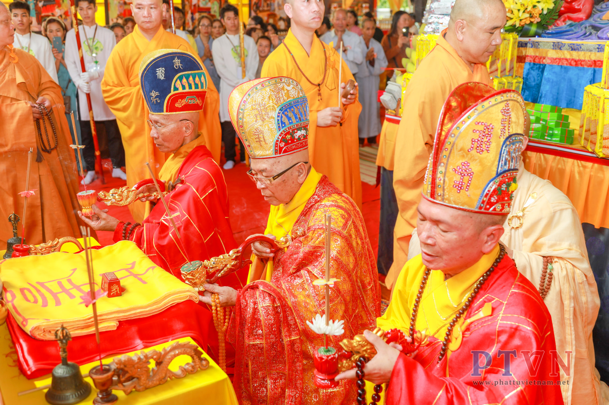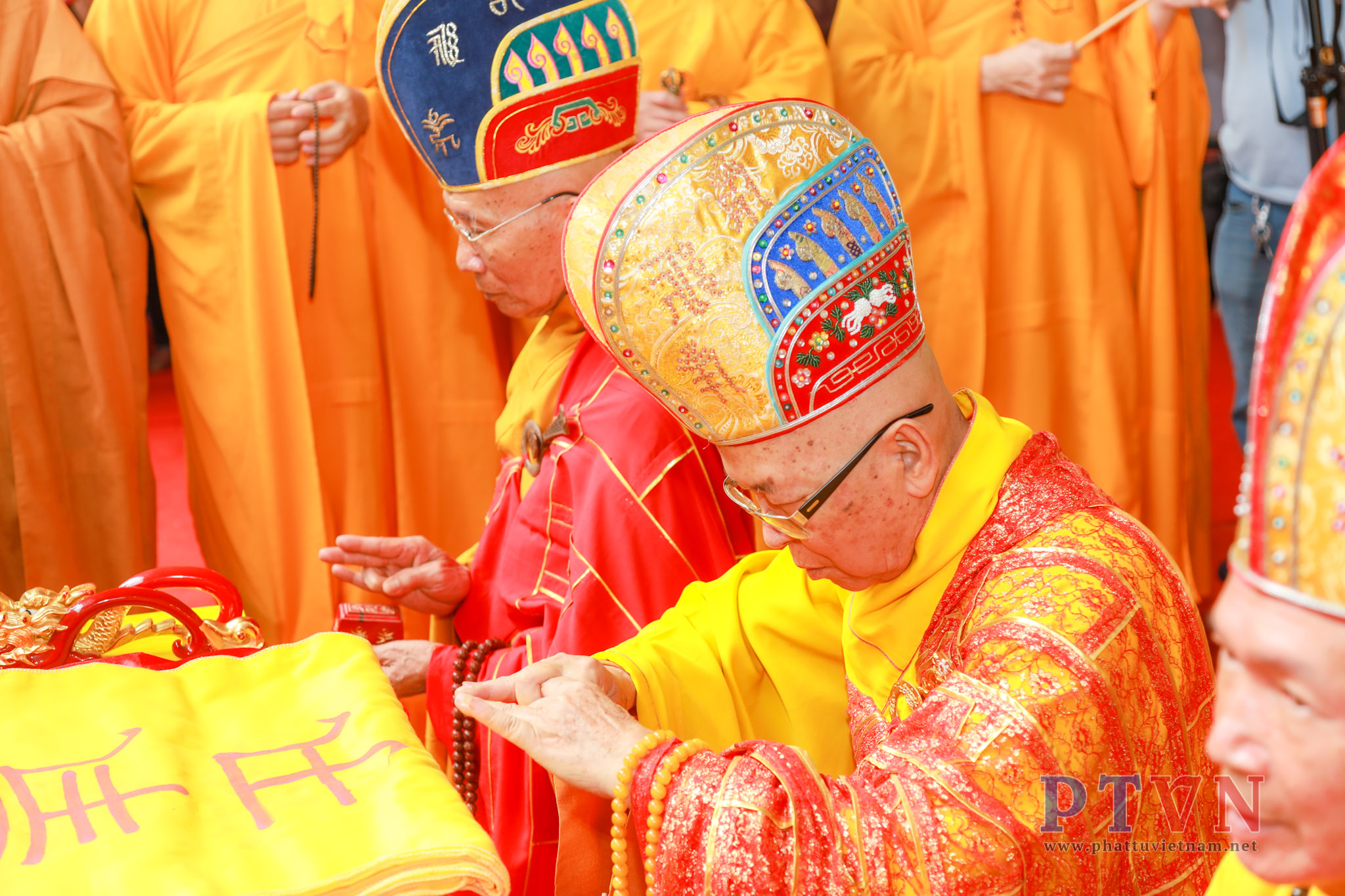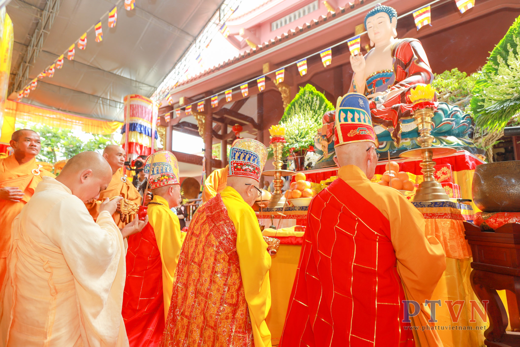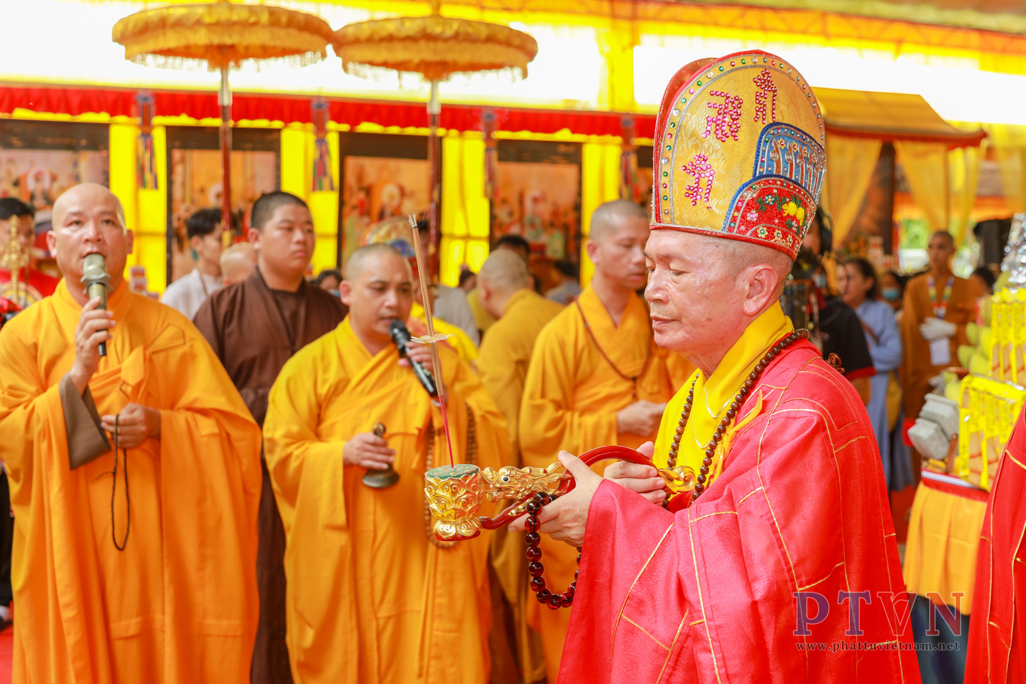 Tiếp đó, Ban Tổ chức đã cung thỉnh chư Hoà thượng quang lâm trai tràng, niêm hương bạch Phật, sái tịnh đàn tràng, tiến hành nghi thức thượng phan, khai diễn pháp sự.