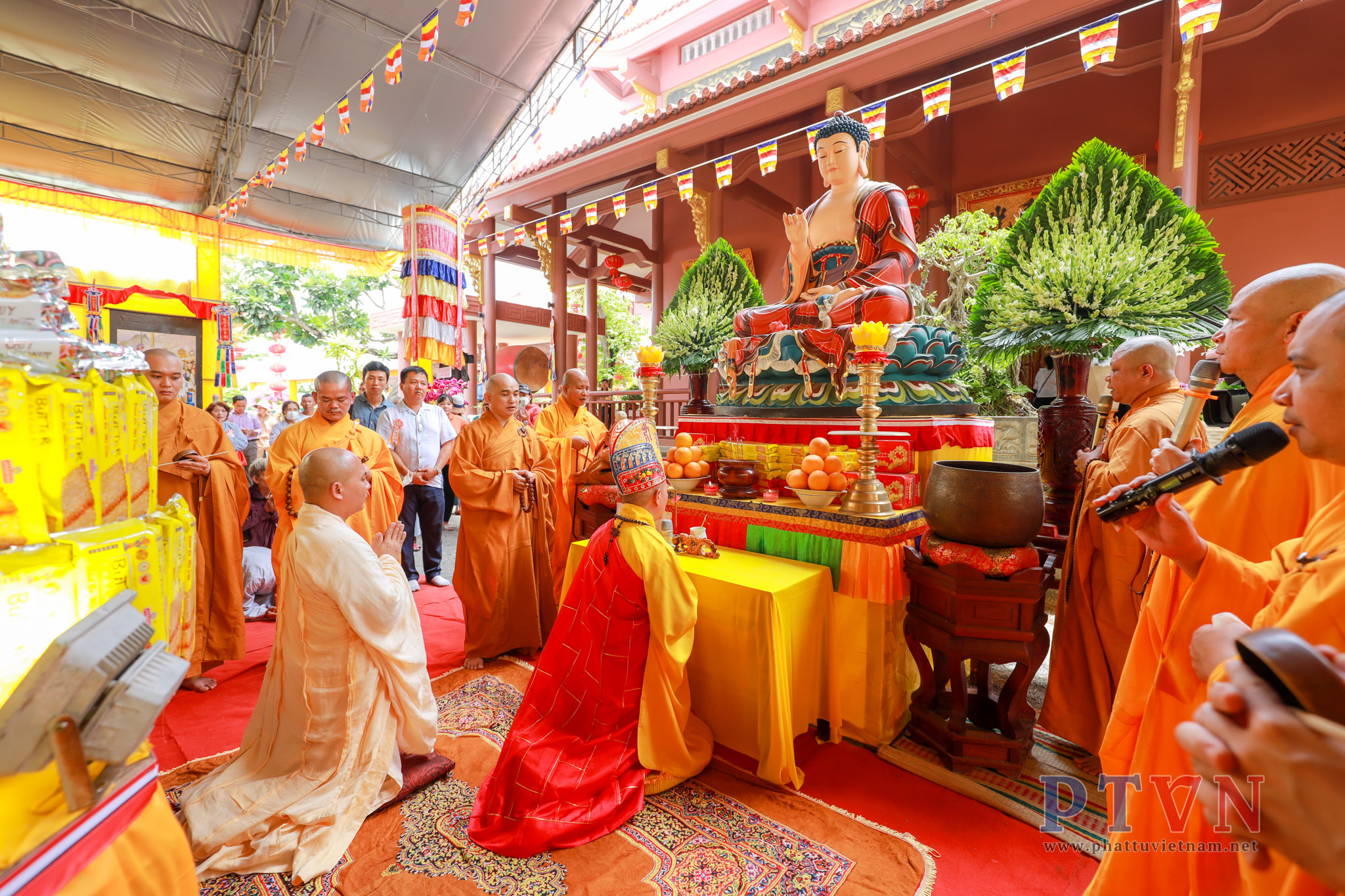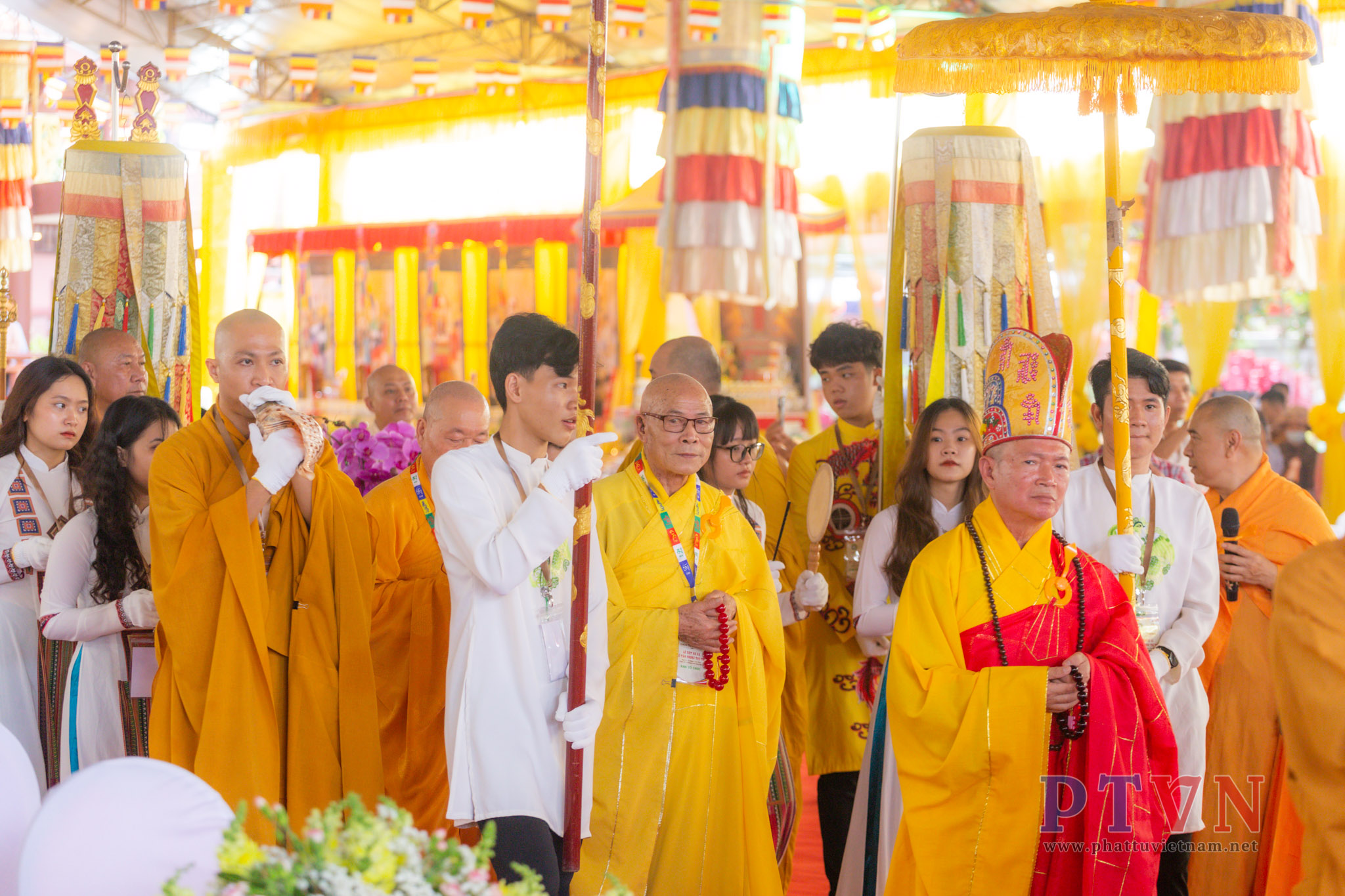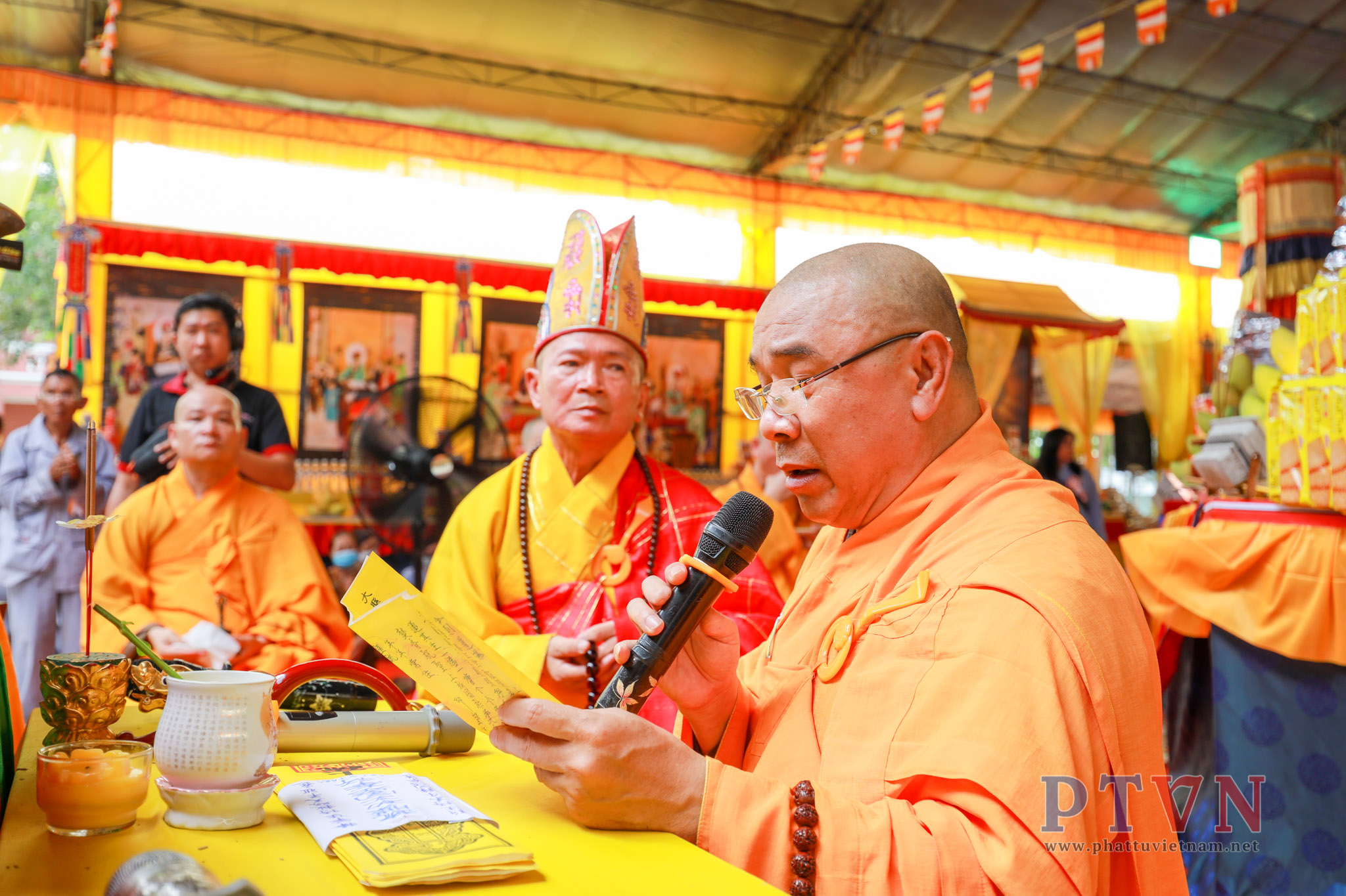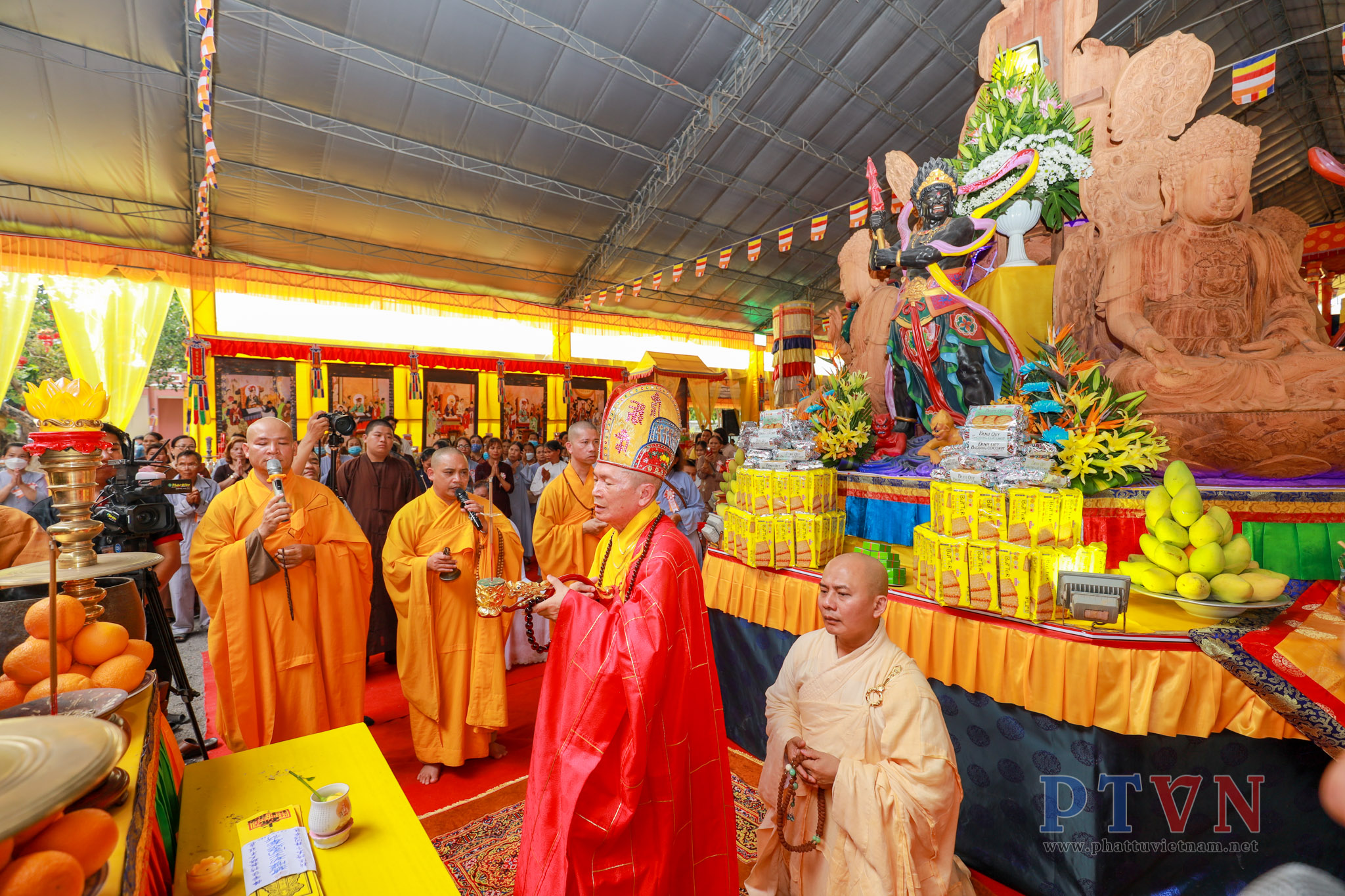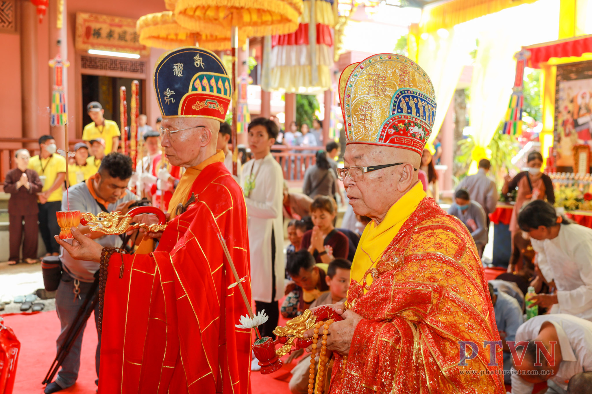 Tiếp đó, Ban Tổ chức đã cung thỉnh chư Hoà thượng quang lâm trai tràng, niêm hương bạch Phật, sái tịnh đàn tràng, tiến hành nghi thức thượng phan, khai diễn pháp sự.