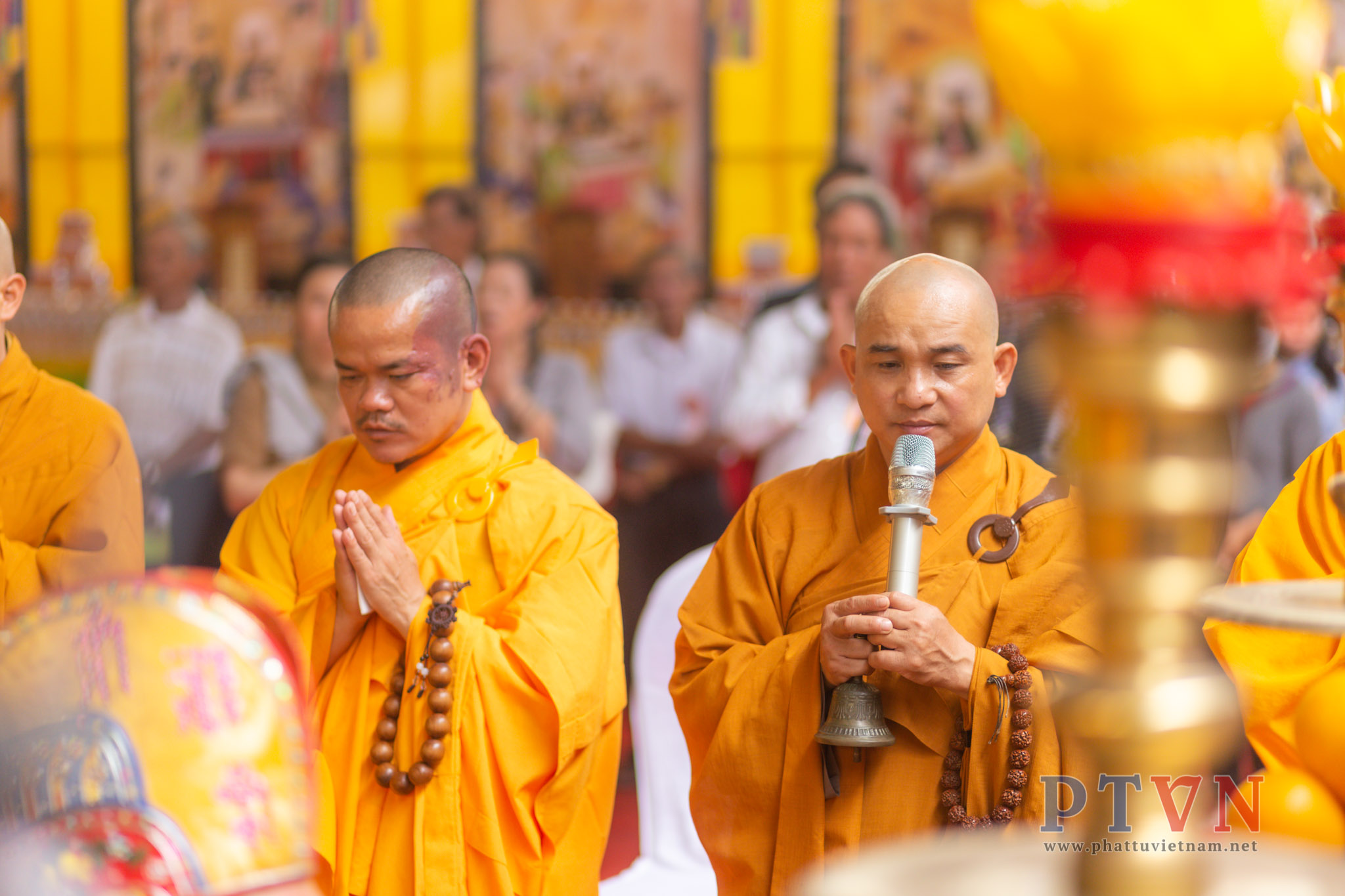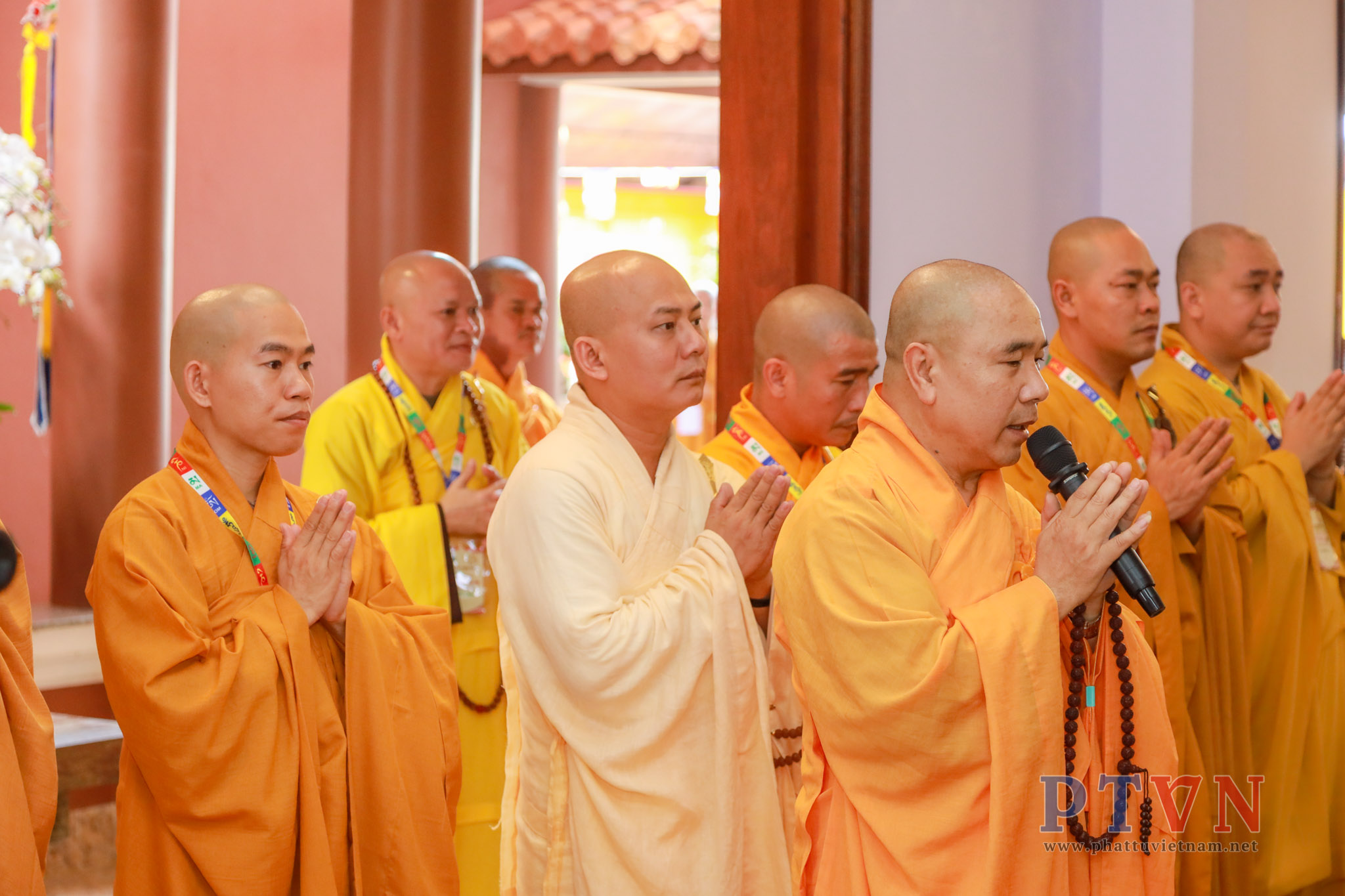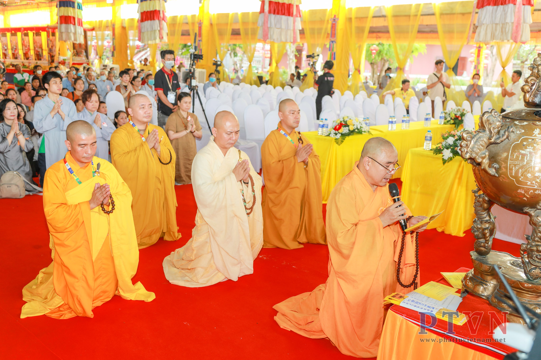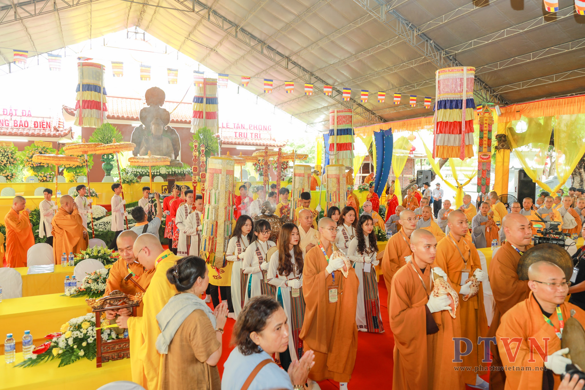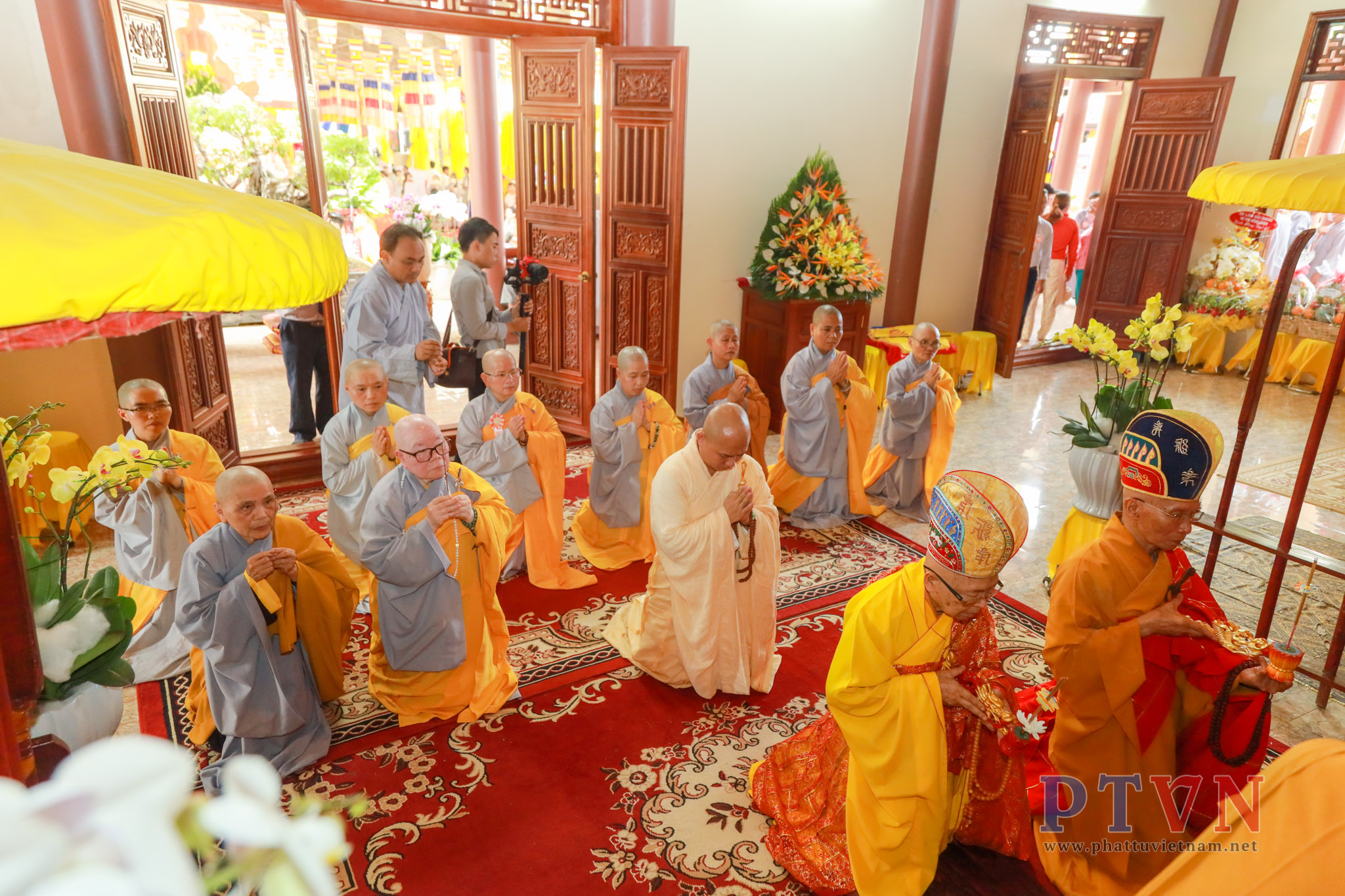 Tiếp đó, Ban Tổ chức đã cung thỉnh chư Hoà thượng quang lâm trai tràng, niêm hương bạch Phật, sái tịnh đàn tràng, tiến hành nghi thức thượng phan, khai diễn pháp sự.