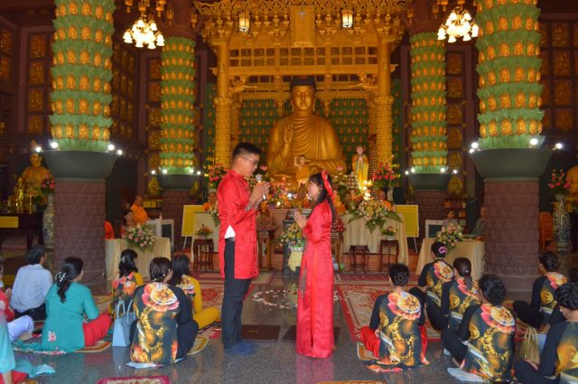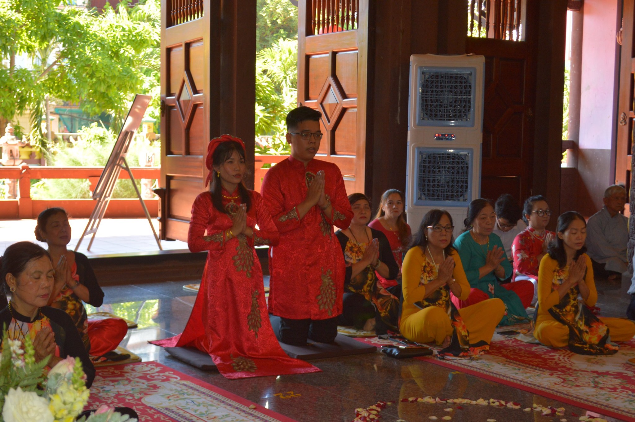 Sau nghi thức niệm hương, tụng kinh Thiện Sanh, đôi bạn trẻ đảnh lễ niệm ân hai đấng sanh thành, phát nguyện làm trọn bổn phận Phật tử tại gia, phát nguyện sống chung thuỷ vợ chồng và thực hiện nghi thức trao nhẫn cưới.