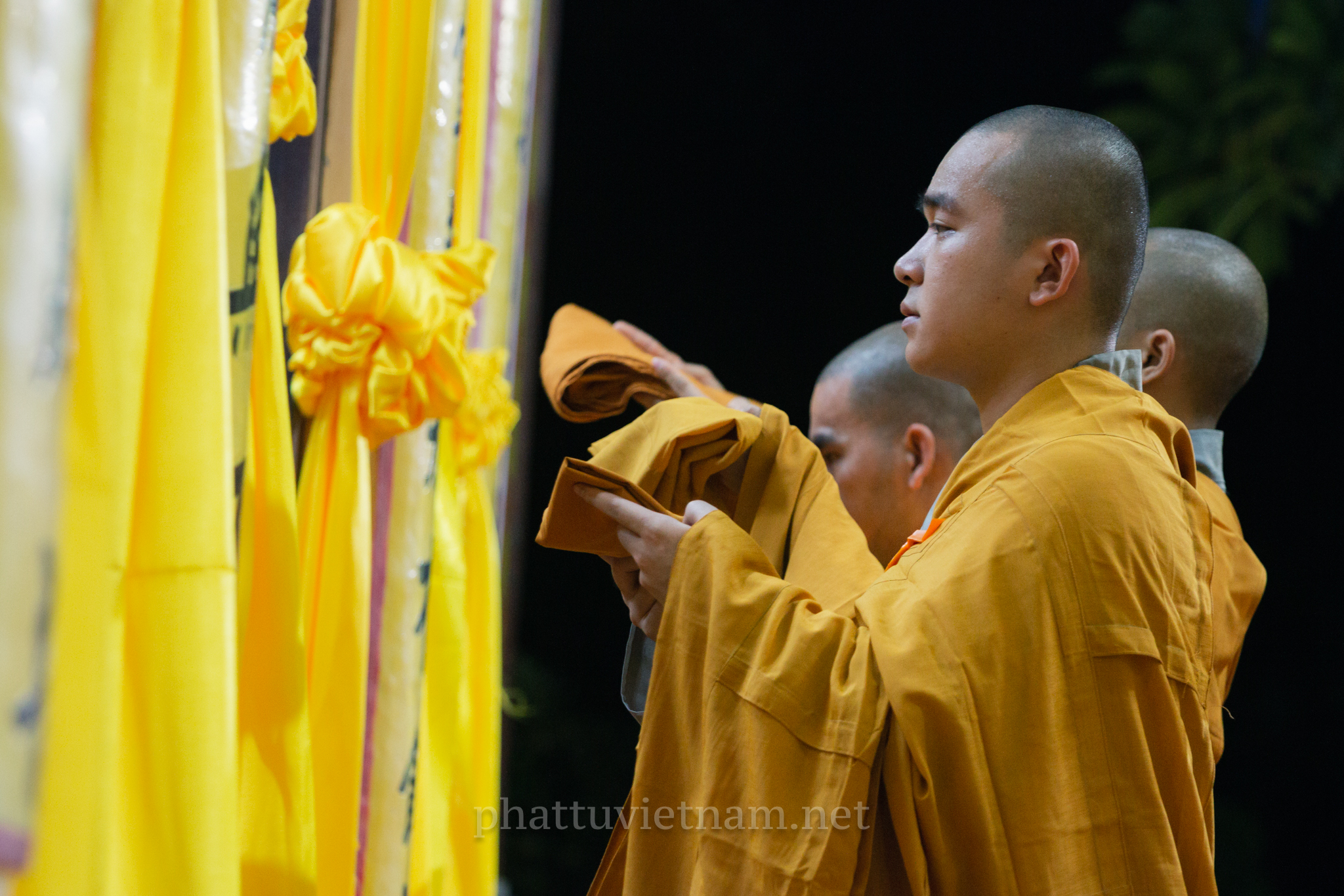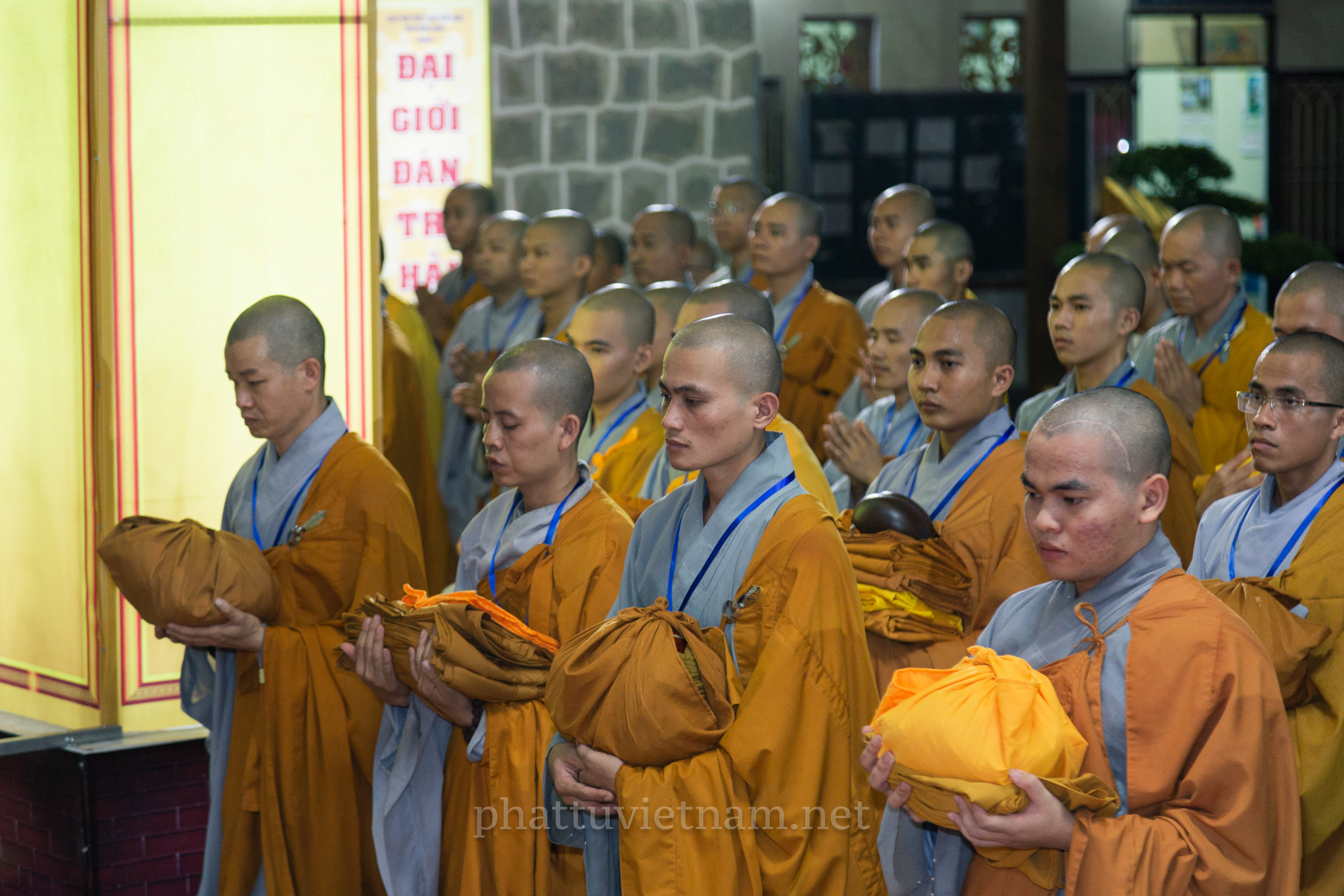 Sau nghi thức truyền giới, các giới tử đã được truyền pháp thọ 3 y, bình bát, toạ cụ và đãy lọc nước. Đây là những pháp khí của Tỳ-kheo và họ không được rời chúng.
