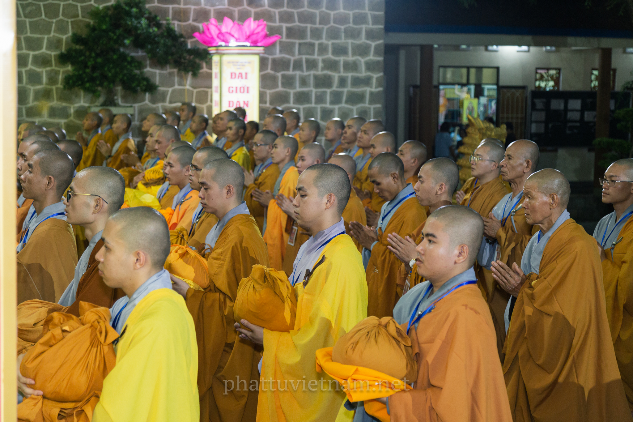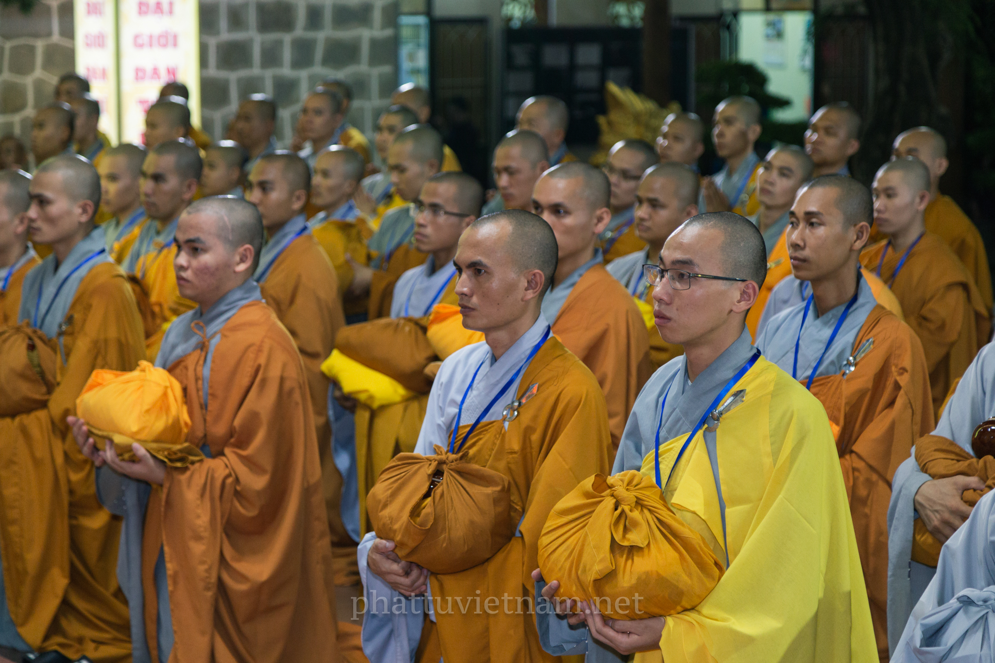 Các giới tử thọ Tỳ-kheo mỗi đàn gồm ba vị. Sau khi trải qua các câu hỏi già nạn (tức các điều kiện để được thọ giới), các giới tử lần lượt được hướng dẫn vào để được truyền giới tướng Tỳ-kheo. Giới tử nhận giới xong chính thức dự vào hàng chúng trung tôn, là Thích tử của Như Lai.