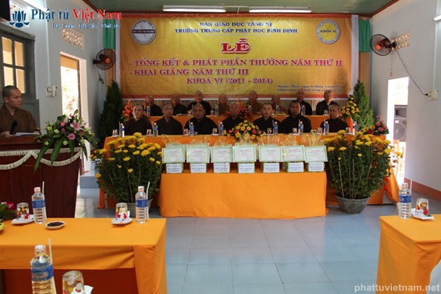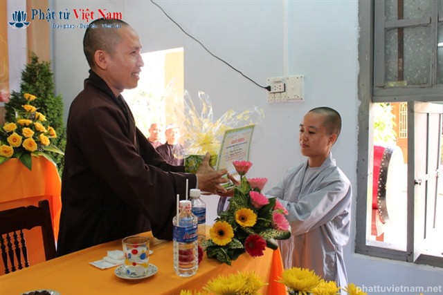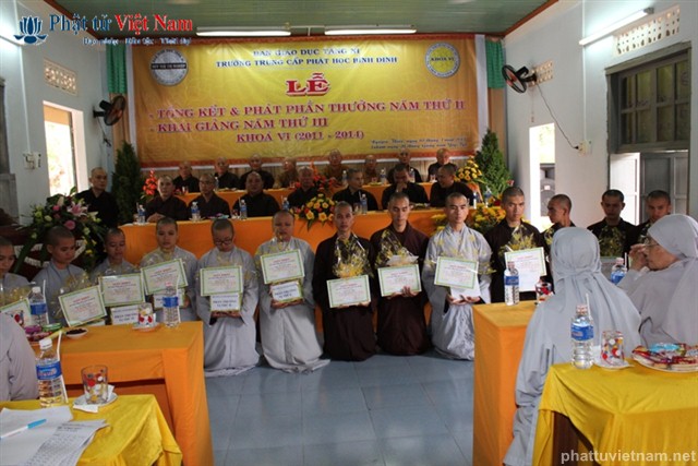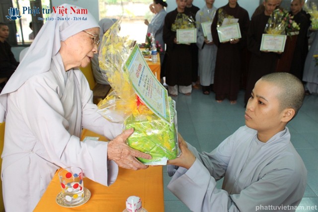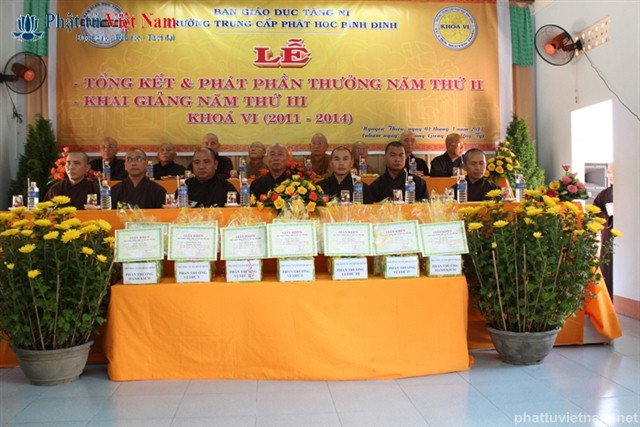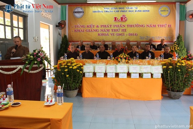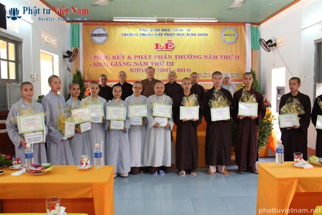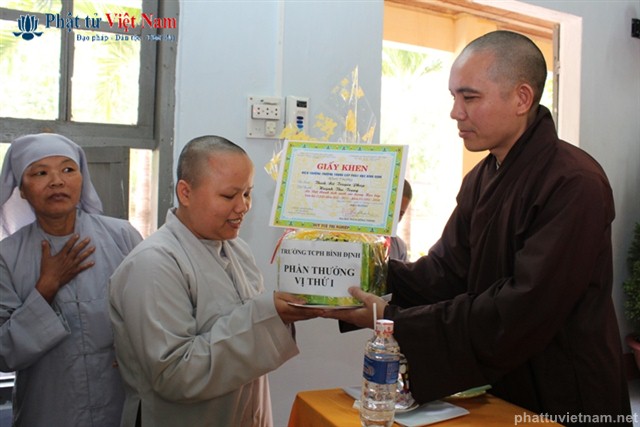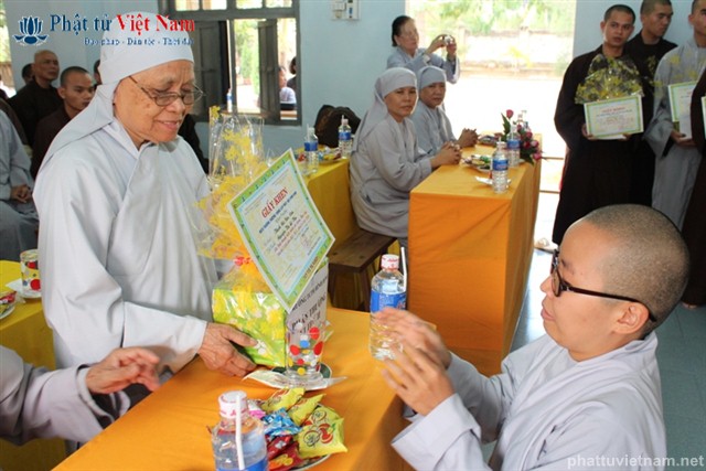 Sau báo cáo tổng kết là phần khen thưởng. Đại diện Ban giám hiệu đã lên đọc danh sách 10 Tăng Ni sinh có hạnh kiểm tốt và có thành tích cao trong học tập, và 4 Tăng Ni sinh có hạnh kiểm tốt và gương mẫu trong tu tập.