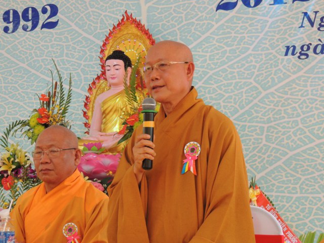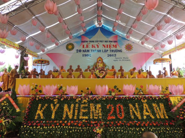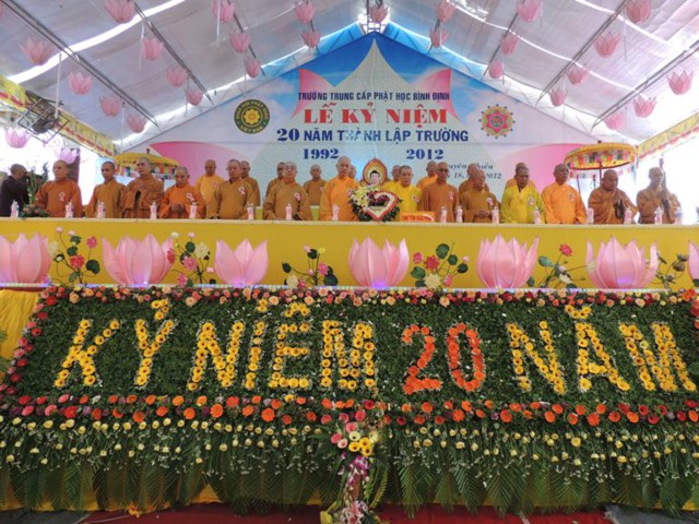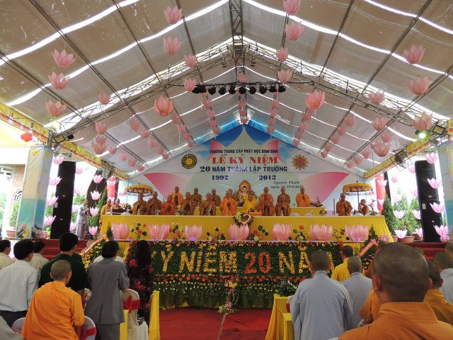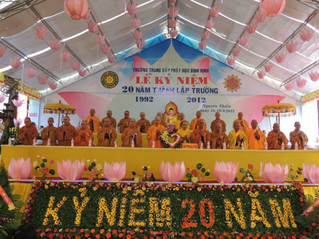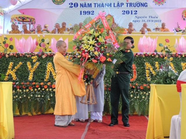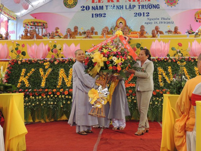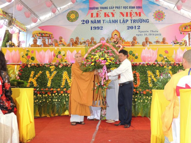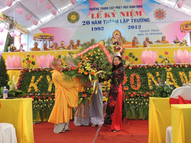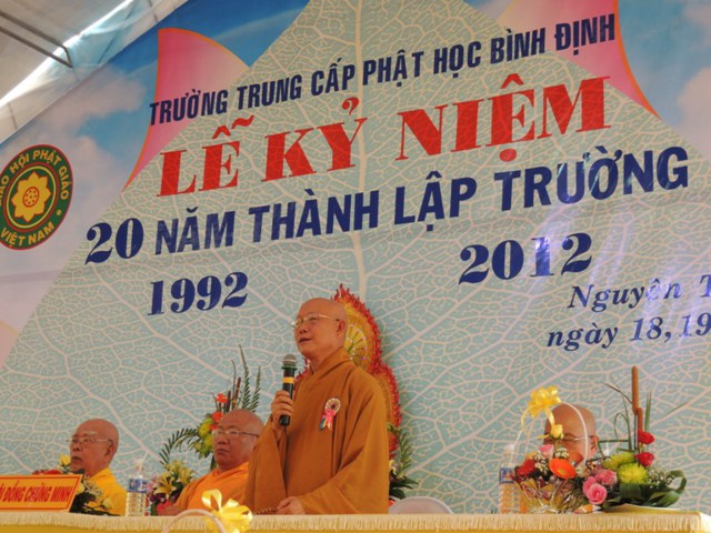 Bà Nguyễn Thị Đàn thay mặt cho các cấp lãnh đạo tỉnh phát biểu tại buổi lễ: Trải qua hai mươi năm hình thành và phát triển, tuy còn nhiều khó khăn về điều kiện cơ sở vật chất, dưới sự lãnh đạo của Ban Trị sự tỉnh, và sự nổ lực của nhà trường đã luôn hướng đến việc đào tạo các thế hệ Tăng Ni có đủ năng lực, kiến thức và tâm nguyện để gánh vát và tiếp nối công tác Phật sự tỉnh nhà. Thay mặt Ban thường trực UBMTTQVN tỉnh Bình Định, Bà đánh giá cao và ghi nhận những nỗ lực cố gắng của tập thể lãnh đạo nhà trường trong công tác Phật sự đào tạo Tăng tài trong 20 năm qua. Ban thường trực UBMTTQVN tỉnh mong muốn trong thời gian đến, dưới sự chỉ đạo của Ban Trị sự Phật giáo tỉnh và sự nỗ lực của Ban Giám hiệu, nhà trường sẽ nêu cao tinh thần trách nhiệm của mình để việc đào tạo giảng dạy có hiệu quả, bổ sung thêm những người con Phật kế thừa tiếp nối vẻ vang ngàn năm của Phật giáo Bình Định.