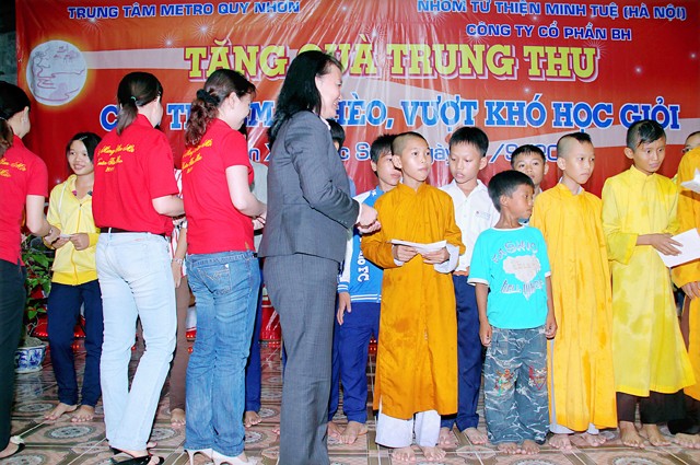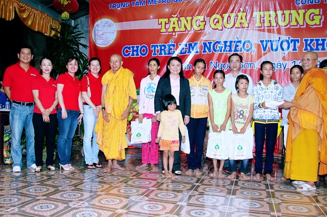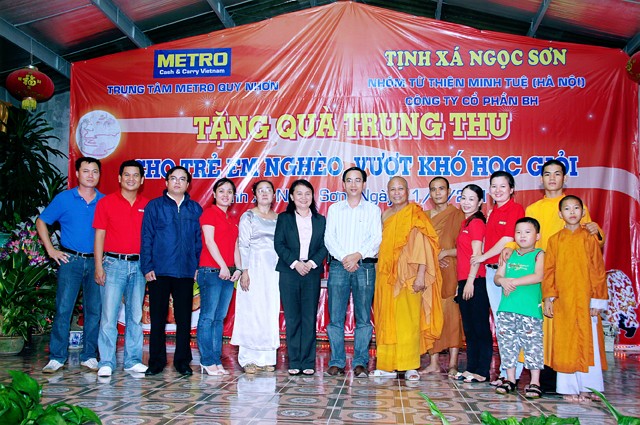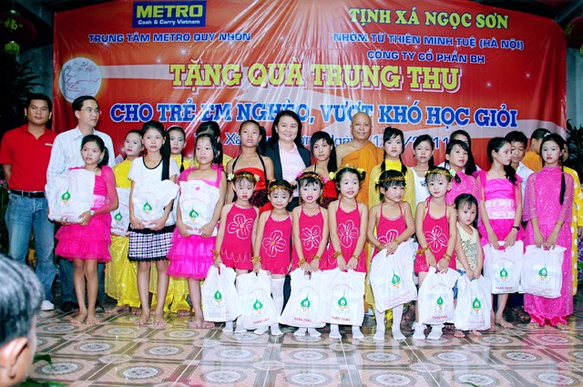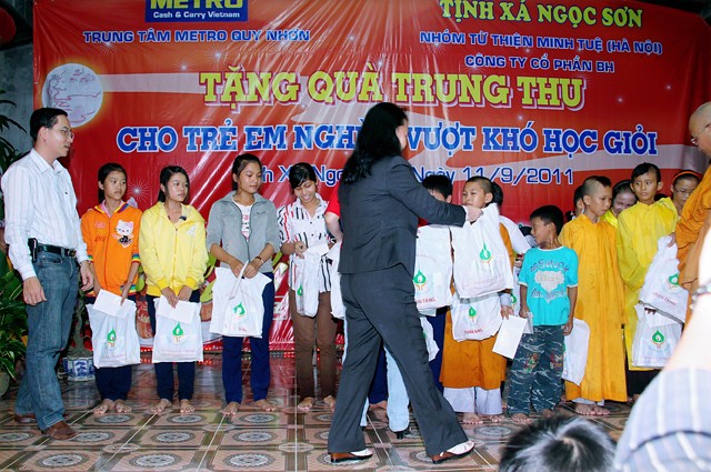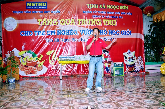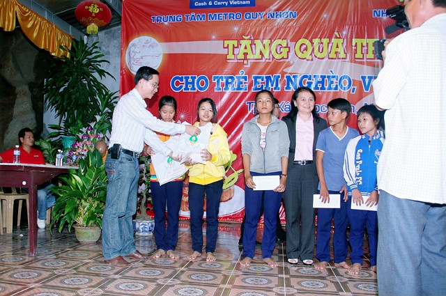 Đại diện nhà tài trợ Trung tâm Metro có ông: Trần Thanh Đức – Giám đốc Metro Qui Nhơn và bà Trần Thị Thanh Thủy – trưởng bộ phận đối ngoại Metrol Việt Nam cùng đông đảo anh chị em quản lý các bộ phận trung tâm Metrol cũng hoan hỷ đồng về tham dự và tận tay trao gần 600 suất quà cho các em học sinh nghèo vượt khó và 25 suất học bổng mỗi suất 200.000$ cho những em học giỏi vượt khó.