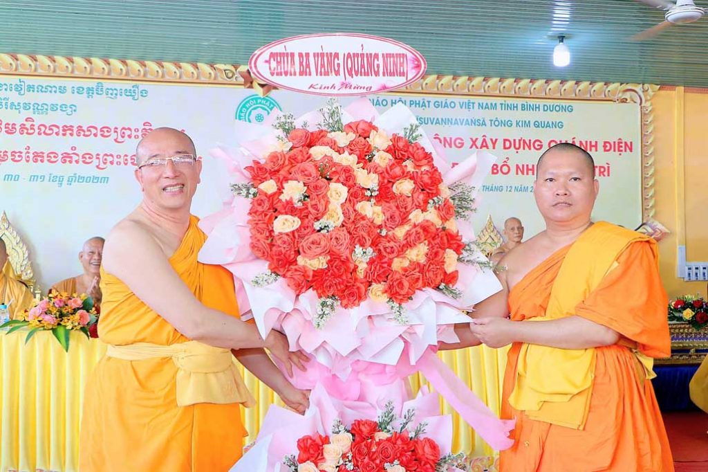 TT. Thích Trí Tâm – Ủy viên Ban Trị sự PG tỉnh Bình Dương, Phó ban Thường trực Ba Trị sự Phật giáo huyện Phú Giáo tặng hoa và tịnh tài chúc mừng