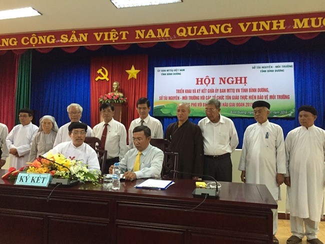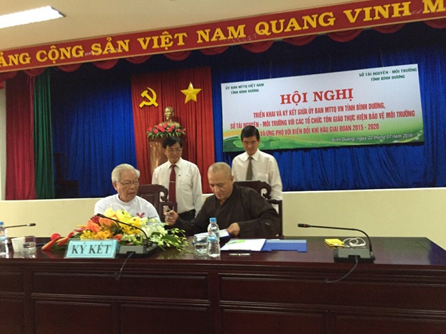 Sau khi ông Chủ tịch UBMTTQ tỉnh phát biểu đúc kết các ý kiến đã đóng góp, hội nghị đi đến ký kết Chương trình phối hợp giữa Ban Thường trực UBMTTQ tỉnh, Sở Tài nguyên và Môi trường tỉnh Bình Dương với các tổ chức tôn giáo thực hiện bảo vệ môi trường và ứng phó với biến đổi khí hậu giai đoạn 2015-2020.