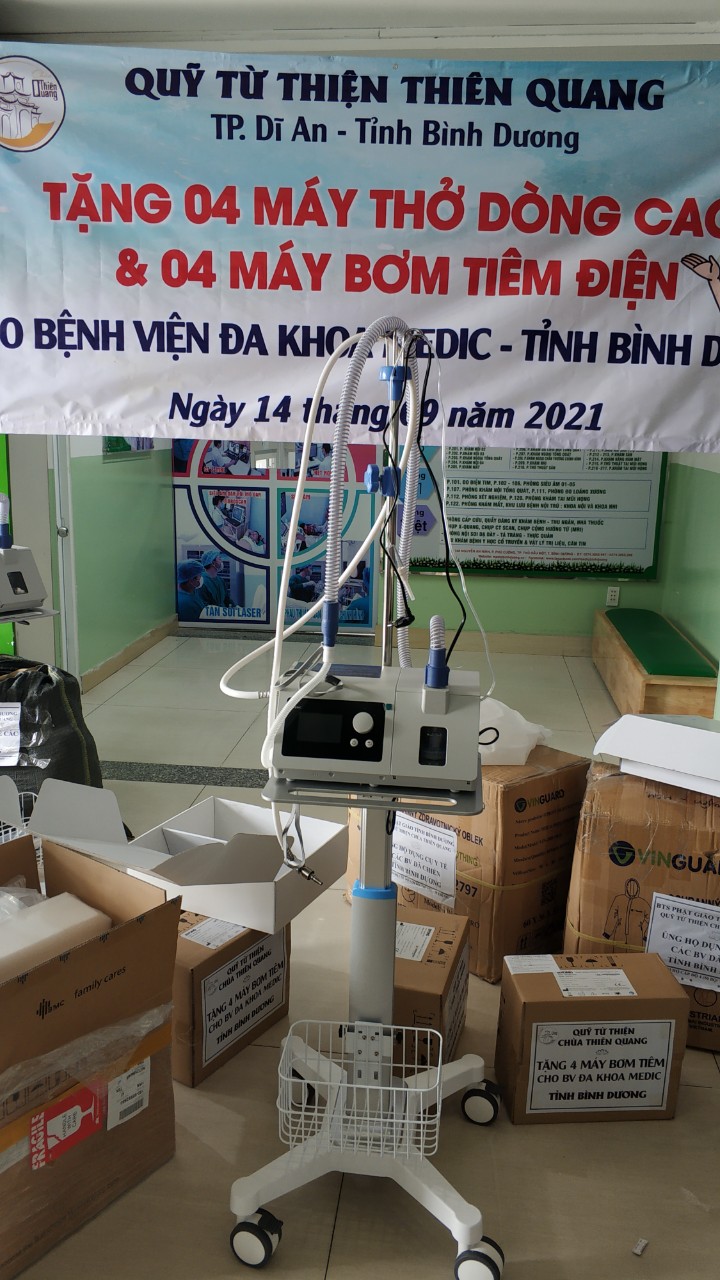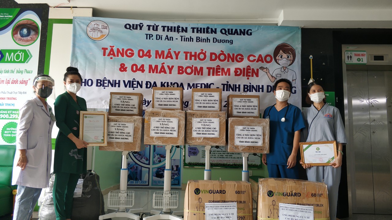 Ngày 14/09/2021, Quỹ Từ thiện Chùa Thiên Quang (Đông Hòa, Dĩ An, Bình Dương, do Ni sư Thích nữ Hương Nhũ trụ trì) đã hỗ trợ 4 máy thở HFNC dòng cao (trị giá 248.000.000 đồng), 4 máy bơm tiêm điện (trị giá 62.400.000 đồng) cho bệnh viện Medic Bình Dương (Thủ Dầu Một, Bình Dương) – một trong những bệnh viện tuyến đầu đang tích cực trong điều trị cho bệnh nhân Covid-19.