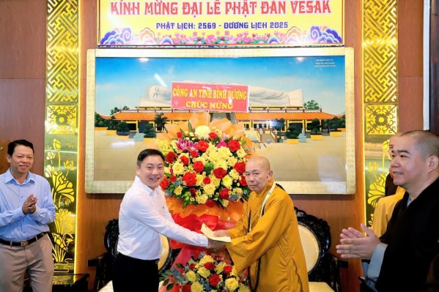 Cảm ơn những tình cảm tốt đẹp và sự quan tâm của lãnh đạo Công an tỉnh Bình Dương đã dành cho Phật giáo tỉnh, HT.Thích Thiện Duyên bày tỏ lòng cảm ơn chân thành và sâu sắc đối với sự quan tâm của lãnh đạo Công an tỉnh, cũng như của cấp ủy, chính quyền địa phương, và cho biết: Đại lễ Phật đản năm nay diễn ra trong sự kiện đặc biệt cả nước chào mừng Kỷ niệm 50 năm Ngày Giải phóng miền Nam, thống nhất đất nước (30/4/1975-30/4/2025). Hòa thượng khẳng định, Phật giáo tỉnh Bình Dương luôn đồng hành cùng các cấp chính quyền và lực lượng Công an tỉnh trong công tác an sinh xã hội, giữ gìn an ninh, trật tự xã hội, sẽ tiếp tục phát huy truyền thống tốt đẹp của đạo Phật, gương mẫu đi đầu trong mọi hoạt động. Đồng thời, tích cực vận động Tăng Ni, Phật tử tại địa phương sống “tốt đời, đẹp đạo”, chấp hành nghiêm chỉnh mọi chủ trương, đường lối của Đảng, chính sách, pháp luật của Nhà nước, đóng góp hết sức mình vào sự nghiệp xây dựng tỉnh Bình Dương ngày càng giàu đẹp, phồn vinh.