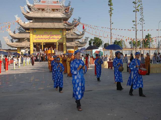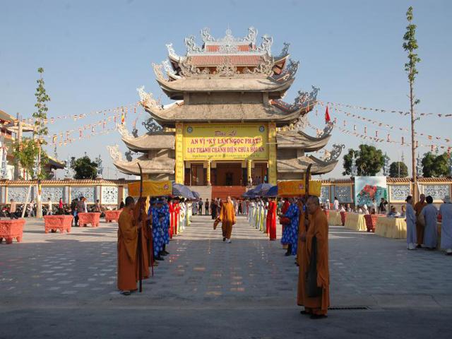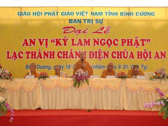 Sau phần niệm Phật cầu gia bị, chào quốc kỳ – đạo kỳ, Thượng Tọa Thích Huệ Thông phát biểu khai mạc Đại Lễ An Vị Kỳ Lam Ngọc Phật – Lạc Thành Chánh Điện Chùa Hội An: “Kỳ Lam Ngọc Phật được chế tác từ khối ngọc nặng gần 46 tấn – khối ngọc này hội tụ linh khí của đất trời từ vùng đất Qùy Hợp tỉnh Nghệ An. Sau khi thành phẩm – tượng ngọc nặng gần 35 tấn, thành phần ngọc: Đa khoáng chất – hàm lượng Codindon (Saphia), hình tượng: Tượng phật nhập Niết Bàn (tượng phật nằm) – mầu sắc: Xanh lam đậm – độ cứng: 8,5 – 9 độ (sau kim cương – 10 độ). Khối ngọc đã được kiểm định và chứng nhận từ Viện Ngọc Học Trang Sức Dozi – Hà Nội. Tượng có chiều dài: 4m2 – chiều cao: 1m7 – độ dầy: 1m6.