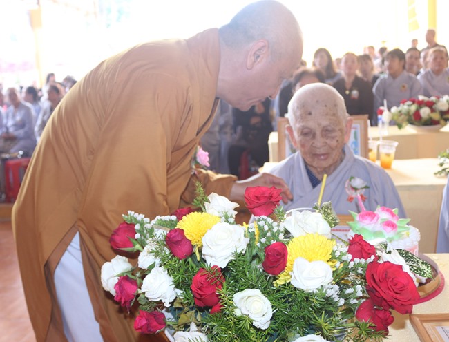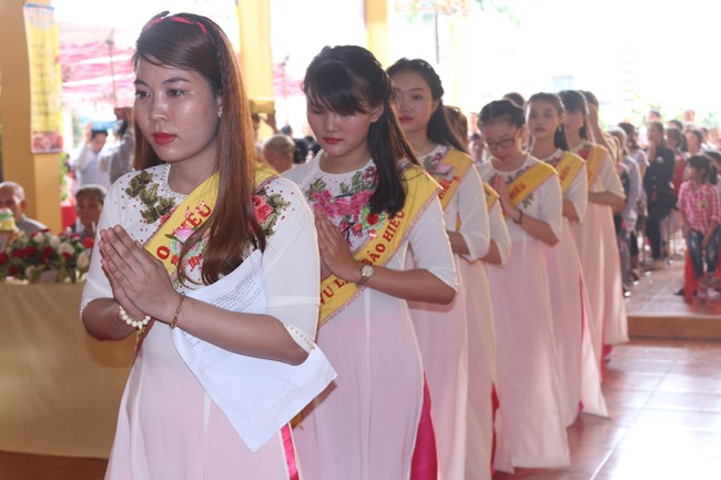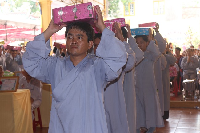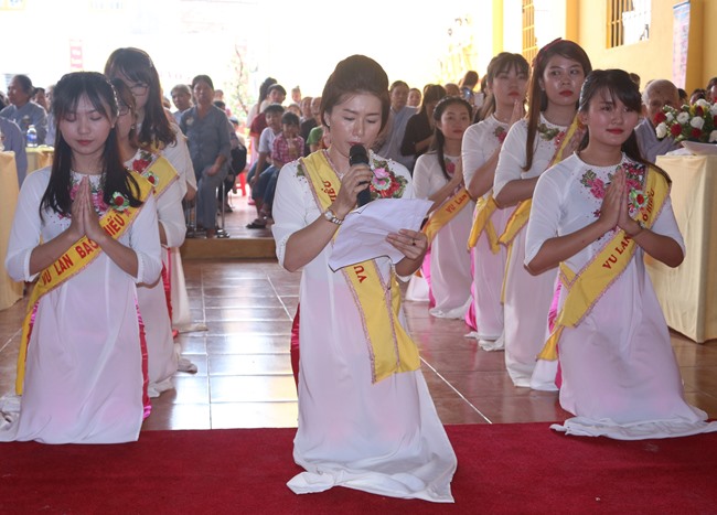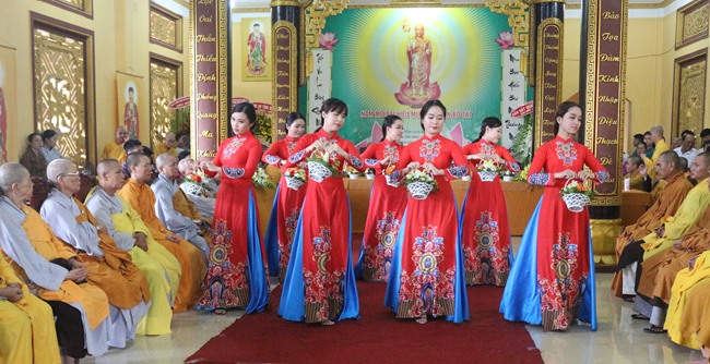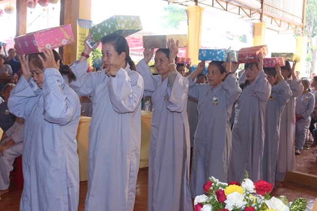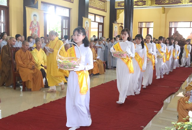 Tiếp đến các em phật tử đã dâng những lẵng hoa tươi thắm lên cúng dường mười phương chư Phật và chư tôn đức chứng minh. Nghi thức cài hoa hồng được tiếp nối chương trình, với những cánh hoa hồng vàng tượng trưng cho sự thoát tục thanh cao của những bậc xuất gia đối với cha mẹ vô cùng thiêng liêng và quý kính. Với chiếc áo nâu sòng chịu sương chịu gió các Ngài đã âm thầm trả ơn cho cha mẹ vô cùng tôn kính. Và thật diễm phúc thay cho những ai đang còn Mẹ để được cài lên ngực áo một đóa hồng đỏ thắm, đượm tất diệu dàng thiêng liêng cao cả để nói lên sự hạnh phúc vô giá của một đời người. Và bất hạnh thay cho những ai không còn Mẹ sẽ nhận một đóa hoa màu trắng để nói lên sự mất mát lớn lao và niềm nhớ nhung da diết.