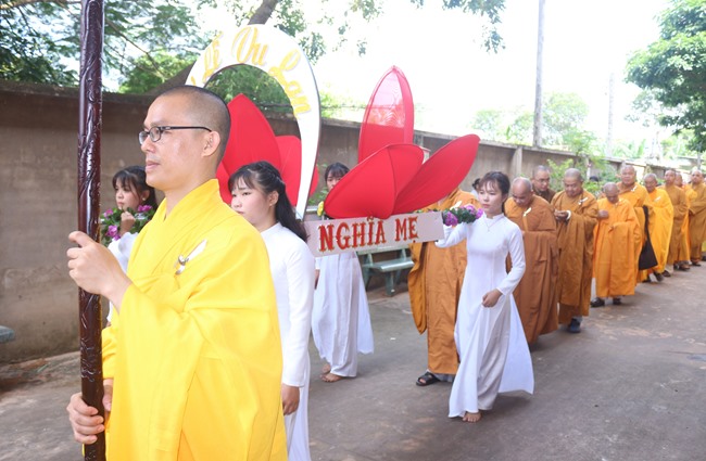 Nơi đây, lời đạo từ của Thượng tọa Thích Minh Nghĩa đã nhắc nhở những người làm con phải biết giữ trọn chữ Hiếu, không chỉ hiếu thảo với ông bà, cha mẹ mà còn phải có hiếu với tất cả mọi người xung quanh, tất cả chúng sanh. Riêng những bậc làm cha làm mẹ giữ trọn chữ Hiếu và còn phải dạy dỗ, chỉ bảo cho con cháu mình ngay từ khi còn nhỏ về chữ Hiếu, đạo làm con phải biết yêu thương chúng sanh, vâng lời cha mẹ để tránh mắc phải những lỗi lầm. Cuối lời, Thượng tọa gửi lời chúc đến đại chúng sẽ có một mùa Vu Lan trọn niềm hiếu hạnh.