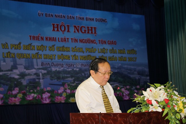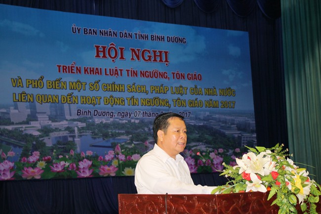 Phát biểu khai mạc, ông: Mai Sơn Dũng nhấn mạnh: “Thực hiện chỉ đạo của UBND tỉnh Bình Dương về việc tổ chức hội nghị triển khai Luật tín ngưỡng tôn giáo cho toàn thể cán bộ, công chức, viên chức trong toàn bộ hệ thống chính trị các cấp trên địa bàn tỉnh. Nhằm truyền tải những thông tin cơ bản, nhiệm vụ cụ thể và phổ biến những Luật mới của Luật để nâng cao nhận thức, ý nghĩa, tầm quan trọng của công tác TNTG, từ đó thực hiện thống nhất theo đúng các quy định của pháp luật hiện hành”.