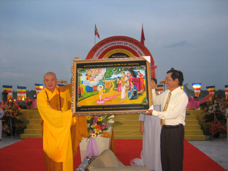Trưởng ban Trị sự THPG Bình Dương Thích Minh Thiện tặng tranh Phật đản sinh cho Tổng giám đốc khu du lịch văn hóa Đại Nam