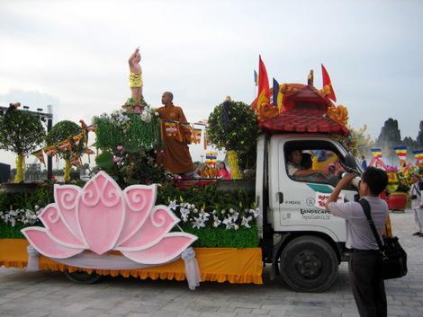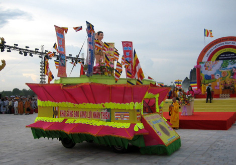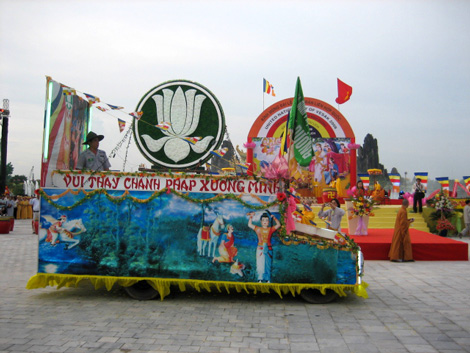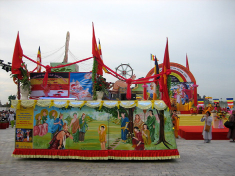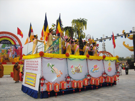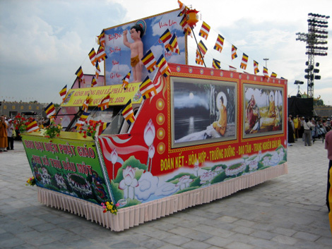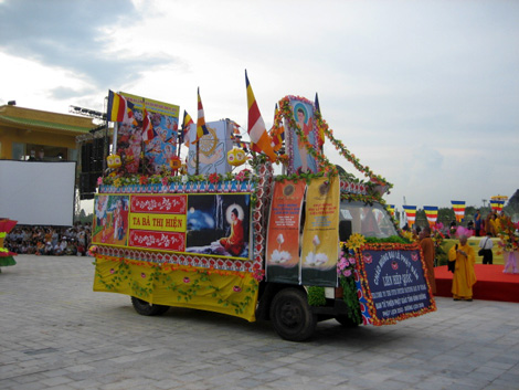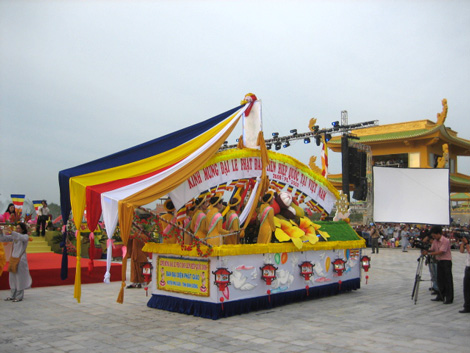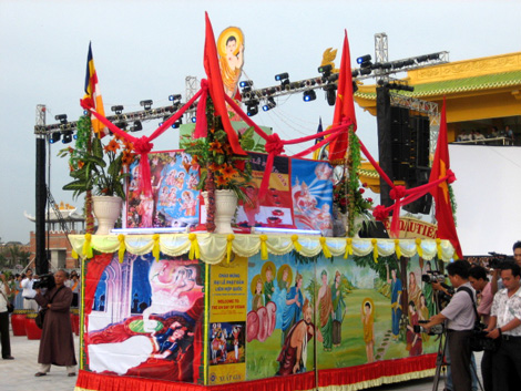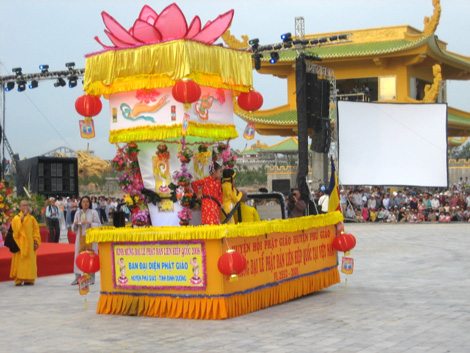 Trước giờ đại lễ bắt đầu, 14 chiếc xe hoa của các đơn vị Phật giáo trong tỉnh Bình Dương đã diễu hành từ chùa Hội Khánh qua lễ đài khu du lịch văn hóa Đại Nam.