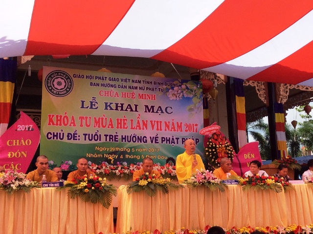 TT. Thích Minh Vũ đã có đạo từ với hơn 600 khóa sinh, Thượng tọa tán thán chùa Huệ Minh là ngôi chùa đầu tiên tại huyện Phú Giáo tổ chức khóa tu mùa hè dành cho các em tuổi trẻ. Cùng với quý Thầy cô tốt nghiệp Học Viện Phật giáo TP.HCM, chùa Huệ Minh đã liên tiếp 6 lần tổ chức khóa tu mùa hè cho các em, và năm 2017 là Khóa tu mùa hè lần VII. Phát huy những thành quả ở những khóa tu mùa hè trước, chúng tôi hy vọng Ban Tổ chức và các em khóa sinh tiếp tục gặt hái được nhiều thành quả tốt đẹp. Thượng tọa còn khuyên nhắccác em khóa sinh về đây trong 4 ngày là để cố gắng tu học, cố gắng sửa đổi từng chút, từng chút một ngay tại chính thân tâm mình để ngày càng hoàn thiện bản thân, giúp ích cho gia đình và xã hội.