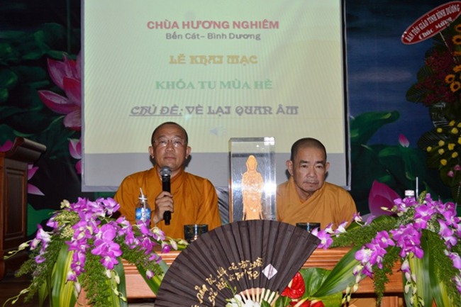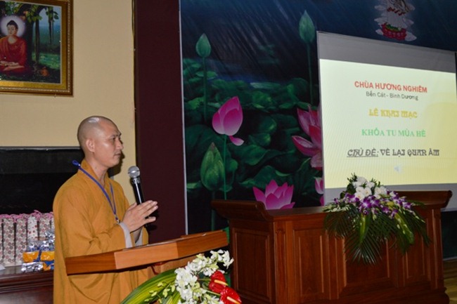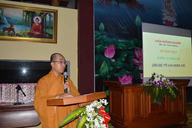 ĐĐ. Thích Trí Chơn, trù trì chùa Hương Nghiêm làm trưởng ban tổ chức khóa tu đọc diễn văn khai mạc