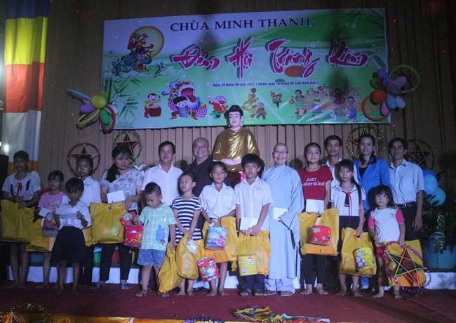 Dịp này, gần 1000 phần quà (gồm: bánh trung thu, lồng đèn, kẹo, đồ chơi …) đã được Thượng tọa Thích Minh Lực, Sư cô trụ trì chùa Minh Thạnh và các mạnh thường quân trao cho các bé để vui đón mừng đêm Trung thu.