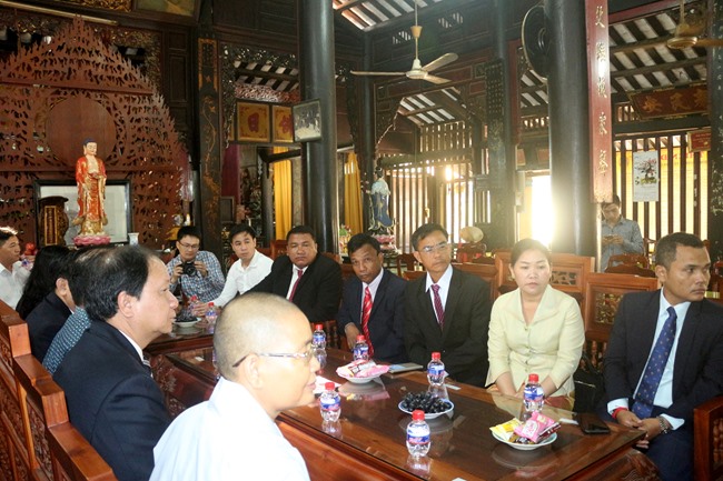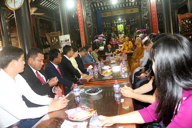 Sau phần thắp hương tưởng niệm tại chánh điện chùa Hội Khánh, đoàn Bộ Lễ Nghi và Tôn giáo Campuchia được Chư Tôn Đức thường trực BTS Phật giáo tỉnh mời vào khách đường để có cuộc nói chuyện và chia sẻ nhân chuyến sang thăm và làm việc với Việt Nam tại tỉnh Bình Dương.