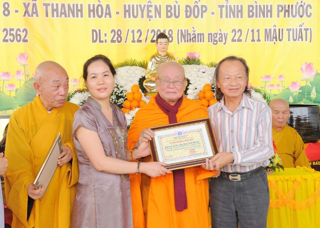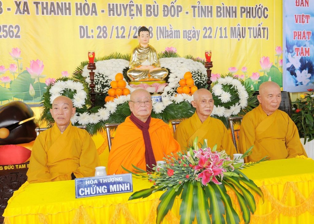 Chứng minh, tham dự có HT Thích Nhật Thiện viện chủ chùa Kiều Đàm Q9. TP HCM. HT.Thích Trí Hườn viện chủ chùa Long Thạnh , huyện Gò Công Tây – Tiền Giang. HT.Thích Đạt An viện chủ chùa Khai Minh, huyện Chợ gạo – Tiền Giang, ĐĐ Thích Chiếu pháp, Phó ban kiêm Chánh Thư ký BTS GHPGVN tỉnh Bình Phước, ĐĐ Thích Giác Đạo, Chánh văn phòng BTS PG tỉnh Bình Phước. ĐĐ Thích Minh Lộc trưởng BTS PG huyện Bù Đốp. cùng chư tôn Thượng toạ, Đại Đức tăng trong và ngoài tỉnh Bình Phước.
