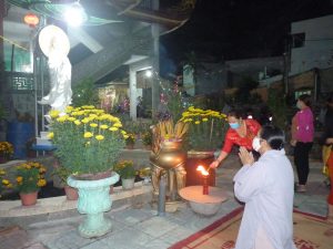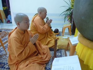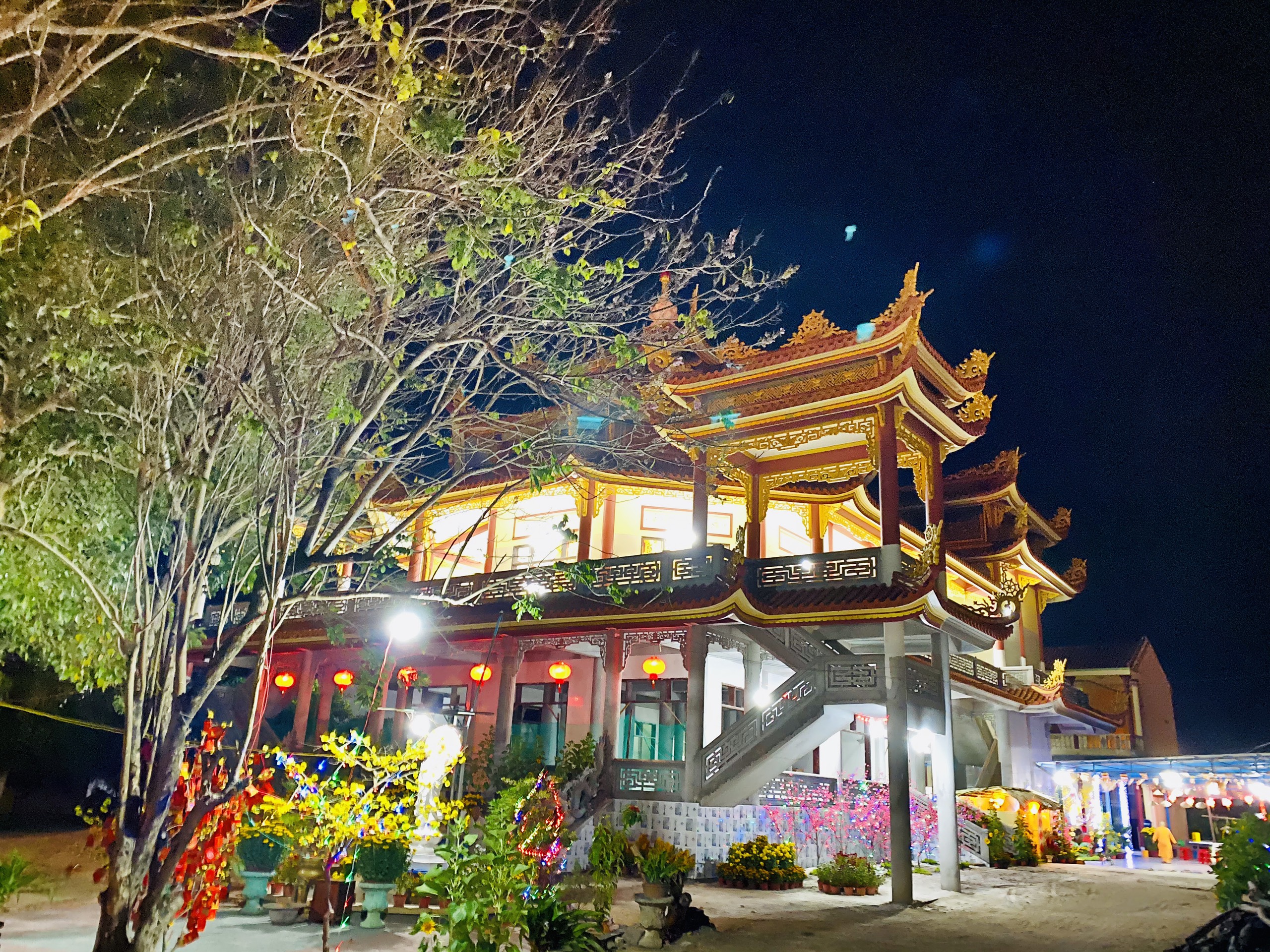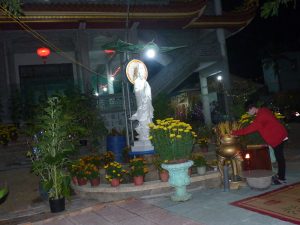 Đúng 12 giờ đêm, khi tiếng chuông chùa ngân vang, Ni sư Thảo Liên cùng Chư ni hướng dẫn khoảng gần 20 Phật tử nam nữ lễ bái Tam bảo, khai tụng Kinh Pháp Hoa, cầu nguyện cho năm mới nhân sanh an ổn, dịch bệnh tiêu trừ, nước nhà thịnh vượng.